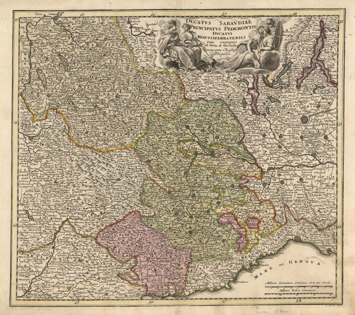 Piccola ma assai curiosa carta dello Stato di Milano raffigurata su di un grande arazzo sorretto dall'aquila austriaca, che lo stringe fra i suoi artigli; ai lati due soldati spagnoli sono invitati a togliere le mani dai suoi possedimenti. Si trova inserita nell’opera "Das Neu-geharnischte Meyland oder umstanliche Bescheibund des jezt von Krieg Staats Meylands." stampata a Norimberga nel 1702 da Germanus Adlerhold.Bibliografia: Cremonini, p. 68, n. 52, fig. a p. 69.