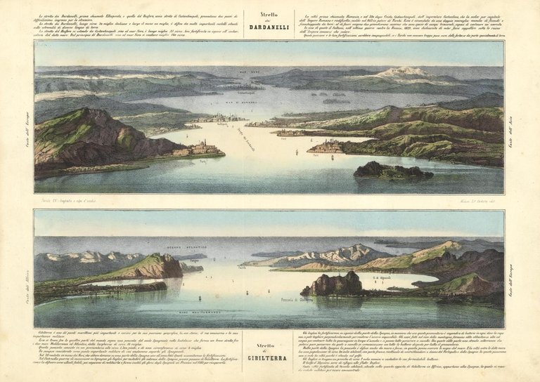 Litografia, antica ed originale, raffigurante gli stretti di Dardanelli e Gilbilterra