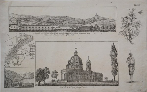Tavola illustrata, numerata 68, tratta dall'opera di C. Mylius De Malerische Fußreise durch das Südliche Frankfreich und einen Theil von Ober-Italien, composta da 4 volumi di testo- ciascuno in due parti - corredati da un atlante, editi a Karlsruhe nel biennio 1818-1819. L'opera è il resoconto del tour attraverso la Francia meridionale e l'Italia settentrionale, compiuto dall'artista; si tratta di uno tra i primi esempi di libri illustrati con litografie. Le due illustrazioni più grandi raffigurano: - quella in alto, una veduta prospettiva della Villa della Regina con il Monte dei Cappuccini, e la chiesa di S. Maria del Monte a Torino - quella in basso, la Basilica di Superga. ' Rara. Table 68 from De Malerische Fußreise durch das Südliche Frankfreich und einen Theil von Ober-Italien, by C. Mylius, 4 vv. and 1 atlas, Karlsruhe, 1818-1819. The two larger views show: -The hill near Turin with the Vigne de la Reine and Capuchin monastery; - View of Basilica of Superga. On the plate, other 4 small images. ' Litho, in very good condition. Cfr.