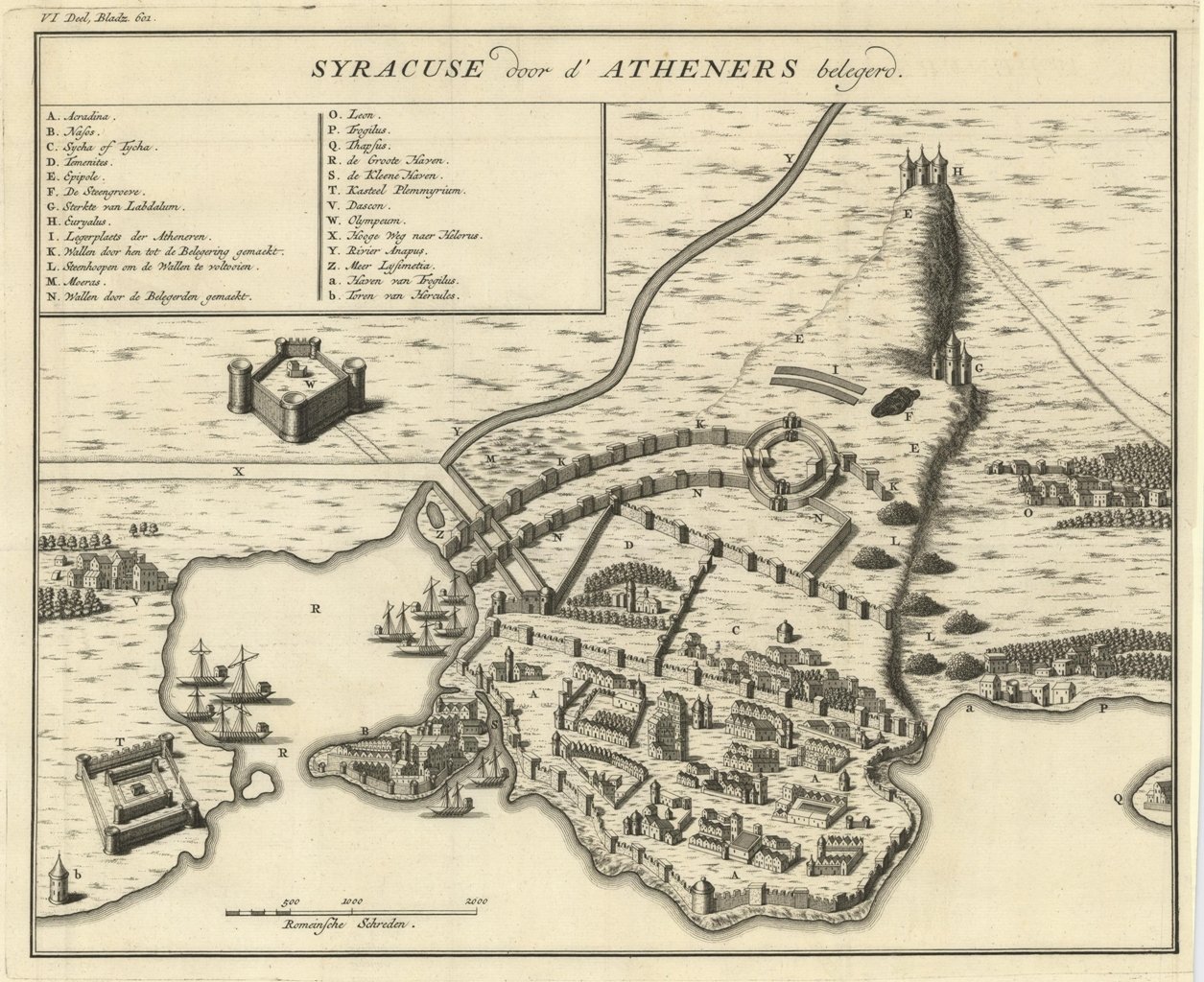 Pianta planimetrica prospettica, antica e originale, della citta di Sisacusa e del suo porto antico