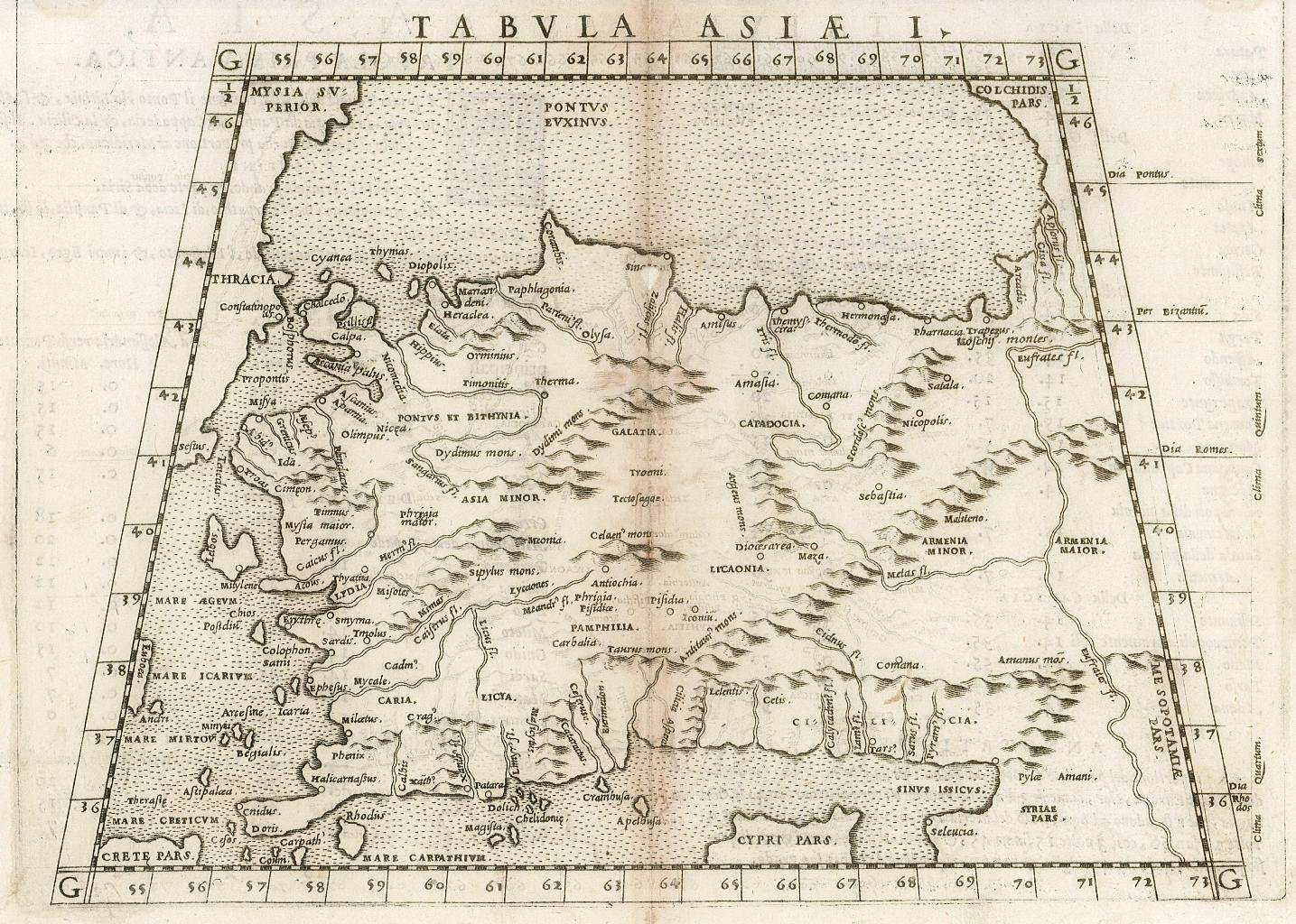 Carta geografica dell'Anatolia in cui sono rappresentate la: Misia, Bitinia, Paflagonia, Pronto, Frigia, Galazia, Cappadocia, Lidia, Livaonia, Caria, Psidia, Licia, Panfilia, Cilicia e parte dell'Armenia. Inserita nell'opera "La Geografia di Claudio Tolomeo alessandrino, già tradotta di greco in italiano da M. Giero. Ruscelli: & hora in questa nuoua editione da M. Gio. Malombra ricorretta, & purgata d'infiniti errori: . Con l'Espositioni del Ruscelli, . Con una copiosa tauola de' nomi antichi, dichiarati co' nomi moderni: dal Malombra riueduta, & ampliata. Et con un Discorso di M. Gioseppe Moleto, . "