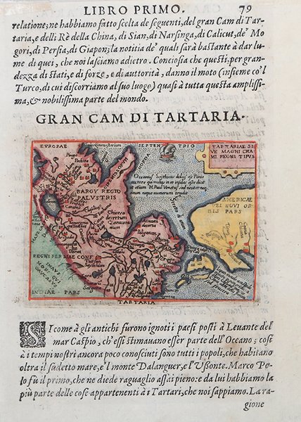 Per la prima volta pubblicata nel "Theatro del mondo" di Pietro Marchetti edito a Brescia nel 1598, questa carta è tratta dalle "Relationi universali di Giovanni Botero", pubblicato sempre in Brescia nel 1599. Le carte, copiate da quelle incise da Philipp Galle per l'Epitome di Ortelius (Anversa 1583), sono incise da un anonimo artista e inserite in una pagina di testo in italiano. Nota anche una ristampa delle stesse, pubblicata da Alessandro Vecchi a Venezia nel 1618 e ancora nel "Theatro del mondo" di Giovanni M. Turrini, (1655), e Scipion Banca (1657). Incisione in rame, in ottimo stato di conservazione. Rara. Miniature map, first published by Pietro Maria Marchetti in "Theatro del mondo" (Brescia 1598), this example is taken from "Relationi universali di Giovanni Botero", Brescia 1599. The second epitome of Abraham Ortelius’ folio !eatrum was produced in Italy by Pietro Maria Marchetti and the 109 new maps, by an unknown engraver, are accompanied by Italian text. The plates are close imitations of those of Philip Galle (see 1577 & 1583), likely the 1593 edition with Italian text.These maps were also used by the same publisher to illustrate an edition of Giovanni Botero’s Le Relationi universali, probably issued in 1599 as its preface was dated 15 December 1598. Another edition published by Alessandro Vecchi, Venice, 1618, included a reissue of the 1599 sheets.Theey were published again in 1655 (there were two issues with different title-pages and dedications dated 15 July & 20 September) and also 1667 in the "Theatro del mondo" by Giovanni Turrini e Scipion Banca. Copperplate with fine later hand colour, in very good conditions. Rare. Cfr. G. King, Miniature Antique Maps, pp. 78-79.