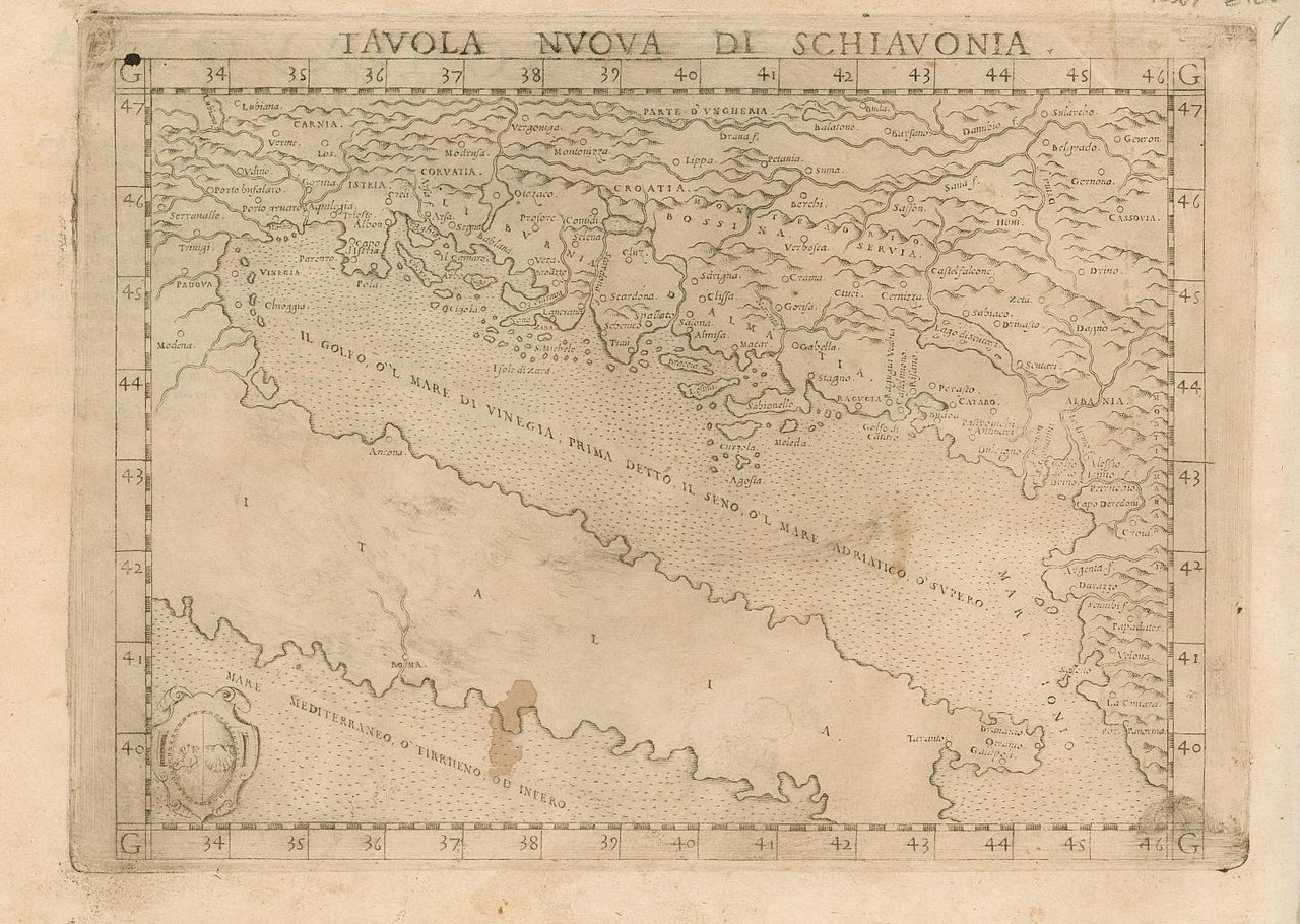 Carta geografica dei Balcani e dell'Adriatico. tratta dall'opera "La Geografia di Claudio Tolomeo alessandrino, già tradotta di greco in italiano da M. Giero. Ruscelli: & hora in questa nuoua editione da M. Gio. Malombra ricorretta, & purgata d'infiniti errori: . Con l'Espositioni del Ruscelli, . Con una copiosa tauola de' nomi antichi, dichiarati co' nomi moderni: dal Malombra riueduta, & ampliata. Et con un Discorso di M. Gioseppe Moleto, . " Autore: Ruscelli Girolamo (1504-1506). Luogo: Balcani - Adriatico. Anno: 1574. Tecnica: incisione in rame. Dimensioni: 179x242 mm. Leggera macchia in basso al centro