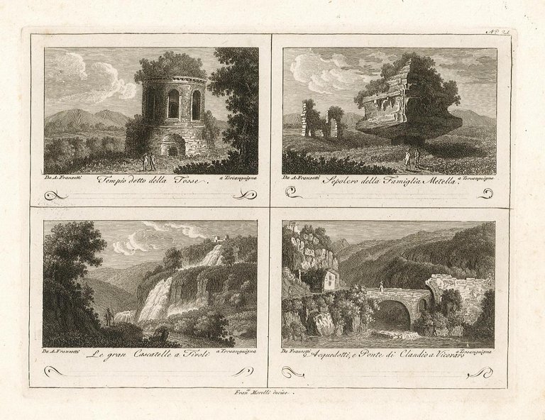 Stampa, antica ed originale, con quattro piccole vedute incise a bulino, caratterizzate da un segno piuttosto incisivo con forti chiaroscuri. Autore: Morelli Francesco inc. Luogo: Roma. Anno: 1820 ca. Tecnica: incisione a bulino. Dimensioni: mm 220x270 ca il foglio.