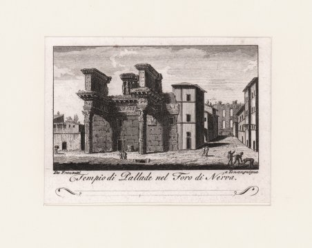 Veduta tratta dalla celebre Raccolta di num. 320 Vedute sì antiche, che moderne della città di Roma. …Incise a bulino in N. 80 rami, In Roma Nella Calcografia di Agapito Franzetti a Torsanguigna Col Permesso. ' L’opera si compone di un frontespizio calcografico e di 80 tavole numerate, ognuna composta da quattro vedute. Viene stampata senza data; molti repertori la datano intorno al 1790 circa, forse perché stampata su carta vergata. Una datazione intorno al 1800 ci sembra tuttavia più plausibile. ' Agapito Franzetti, calcografo attivo a Roma con bottega tra via del Corso e Torsanguigna, è noto per le sue piccole incisioni di veduta che servivano spesso come biglietti da visita. Tutte contengono, infatti, una linea in basso, dove si poteva apporre il proprio nome ad inchiostro. Come indicato nel titolo, le vedute raffigurano sia monumenti e antiche rovine che vedute “moderne”, con piazze, chiese e ville. Ciascuna tavola reca, in basso al centro, il nome dell’incisore. Gli artisti coinvolti sono sei: Jean-Jerome Baugean; Antonio Giuseppe Barbazza; Giovanni Battista Cipriani; Francesco Morelli; Antonio Poretta e Domenico Pronti. Molte delle vedute derivano dalla celebre opera di Giuseppe Vasi, Delle magnificenze di Roma antica e moderna. Pubblicata in 10 volumi dal 1747 al 1761, l’opera presenta 238 incisioni in rame, ciascuna incisione con testo narrativo che fornisce informazioni storiche e documentarie. ' Acquaforte, in buono stato di conservazione. ' Bibliografia: A. Bertarelli, H. Prior, Il biglietto da visita italiano. Contributo alla storia del costume e dell'incisione nel secolo XVII, Bergamo 1911, p. 162. View of the city printed in Rome by the publisher Agapito Franzetti. Taken from Raccolta di num. 320 Vedute sì antiche, che moderne della città di Roma. …Incise a bulino in N. 80 rami, In Roma Nella Calcografia di Agapito Franzetti a Torsanguigna Col Permesso. ' The work consists of an intaglio frontispiece and 80 numbered plates, each consisting of four views. It is printed without date; many repertories date it around 1790, perhaps because it was printed on laid paper. A date around 1800 seems more plausible. Franzetti, a chalcographer working in Rome with a workshop between Via del Corso and Torsanguigna, is known for his small engravings of views that were often used as business cards. They all contain a line at the bottom where one's name could be written in ink. The small views were often printed four to a sheet. As indicated in the title, the views depict both monuments and ancient ruins and "modern" views, with squares, churches and villas. Each table bears, at the bottom center, the name of the engraver. There are six artists involved: Jean-Jerome Baugean; Antonio Giuseppe Barbazza; Giovanni Battista Cipriani; Francesco Morelli; Antonio Poretta and Domenico Pronti. ' The views are made after Giuseppe Vasi’s monumental work Delle magnificenze di Roma antica e moderna. Published in 10 volumes from 1747 to 1761, the work features 238 copper engravings, each engraving with a narrative text that provides historical and documentary information. ' Bibliografia: A. Bertarelli, H. Prior, Il biglietto da visita italiano. Contributo alla storia del costume e dell'incisione nel secolo XVII, Bergamo 1911, p. 162. Cfr.