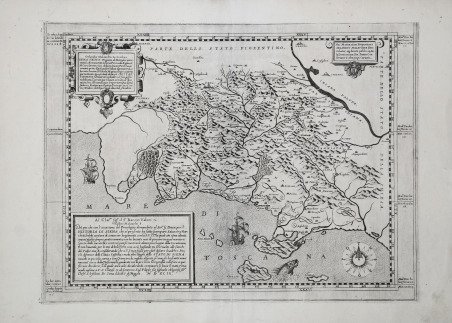 In alto a sinistra, in un cartiglio ornato con fregi e sormontato dallo stemma dei Medici, si legge: Orlandus Malavolta Lectoribus. SENA VETUS Originem ab Hetruscis, incrementu(m) a Romanorum Colonia P. Cornelio Rufino, et M. Curio Dentato Coss. Deducta Ioanne Pont. huius nominis primo Episcopalem habuit dignitatem Libertate donata est Carolo Magno insigni victoria parta Montis Aperti clade dicta est CIVITAS VIRGINIS, familiarum splendore et suis gestis nobilitata, suorum’que Civium virtute viribus aucta hoc sibi vendicavit Imperium, Quo demum faelicius beatius’que Optimo Principi suo Cosimo Medices obtemperandi daretur facultas. Nel cartiglio in alto a destra: Has Matematicas Proportiones ORLANDUS MALAVOLTA dimetiebatur, atq decreto publico in Aula Dominorum Sen. Status Conservatoru(m) olim pingi Curavit. In basso, in un ampio riquadro, una lunga dedica di Ubaldino Malavolti (figlio dell’autore): Al Clar.mo Sig.re il S.r Baccio Valori. Ubaldino Malavolti S. Da poi che con l’occasione del Privilegio domandato al Ser.mo G. Duca per l’HISTORIA DI SIENA, che al presente ha fatte stampare Salvestro Marchetti, hebbi ventura di conversar lungamente con la S. V. Cl.ma la quale con som(m)a attentione m’ascoltò sempre gratiosamente, non ho lasciato mai di pensare in qual maniera (preso da le sue virtù, e cortesie) potessi mostrarle almen piccol segno della Servitù mia; E non havendo, per le mie deboli forze, cosa a ciò bastante, mi son rivolto alle fatiche del Padre mio; E considerando che a V.S. non fusse per esser discaro il vedere i Siti, e le distanze delle Città, e Castella, e molti altri luoghi dello STATO DI SIENA raccolti in picciola carta, e con Geometriche misure e disposti, si come gli ha sentiti nominare nel corso della Historia, ho giudicato con la presente Corografia sodisfare a questo mio desiderio; Col quale anco a lei desiderando compiacere, le bacio le mani, rimanendo insieme a V.S. Clariss. Et al Generoso Sig.r Filippo suo figliuolo obligatiss. Ser.re Che N. S. le feliciti. Di Siena il di XXV di Maggio. M D XC IX. Carta priva di scala grafica; orientazione fornita con una rosa dei venti nel mare, il nord è in alto. Nel lato sinistro indicati i climi, a destra la durata del giorno alle varie latitudini. Graduazione ai margini di 1’ in 1’, da 41° 30’ a 42° 58’ di latitudine e da 33° 30’ a 35° 30’ di longitudine. “La carta fu realizzata esplicitamente per corredare la Historia di Siena, che veniva stampata proprio in quell’anno da Silvestro Marchetti. Interessante è l’indicazione contenuta nel cartiglio in alto a destra, secondo cui Malavolti avrebbe dipinto questa stessa carta, con matematiche proporzioni, nella Sala dei Conservatori della Repubblica (1573). La notizia è confermata da Del Rosso in una pubblicazione del 1905, nella quale riporta uno stralcio della pittura. Almagià ritiene che l’informazione non sia attendibile, non essendovi traccia alcuna della pittura originale e perché il Malavolti, storico di professione, non sarebbe stato in grado di compiere un rilievo del genere. Di fatto, la carta deriva essenzialmente dalla Tuscia di Girolamo Bellarmato, come dimostrano l’identicità delle coordinate e le sostanziali somiglianze di tutti gli elementi. Tuttavia, il Rombai ha definitivamente accertato che la carta del Malavolti fu fatta affrescare nella sala del Palazzo Comunale di Siena nel 1573, e andò distrutta – forse alla fine dell’800 – a seguito di alcuni restauri. Inoltre, la conferma di studi geografici del Malavolti, provano un suo possibile contributo personale alla pittura murale, probabilmente ispirata al lavoro originale del Bellarmato” (cfr. Cartografia e topografia italiana del XVI secolo, p. 1992). Orlando Malavolti (Siena 1515-1596), il più noto degli storici senesi, nacque in Siena il 17 giugno 1515, ricoprendo fin da giovane diverse cariche pubbliche in patria. Caduta la Repubblica divenne, sotto il principato Mediceo,. At upper left, in a cartouche adorned with friezes and surmounted by the Medici coat of arms, it reads: Orlandus Malavolta Lectoribus. SENA VETUS Originem ab Hetruscis, incrementu(m) a Romanorum Colonia P. Cornelio Rufino, et M. Curio Dentato Coss. Deducta Ioanne Pont. huius nominis primo Episcopalem habuit dignitatem Libertate donata est Carolo Magno insigni victoria parta Montis Aperti clade dicta est CIVITAS VIRGINIS, familiarum splendore et suis gestis nobilitata, suorum’que Civium virtute viribus aucta hoc sibi vendicavit Imperium, Quo demum faelicius beatius’que Optimo Principi suo Cosimo Medices obtemperandi daretur facultas. Nel cartiglio in alto a destra: Has Matematicas Proportiones ORLANDUS MALAVOLTA dimetiebatur, atq decreto publico in Aula Dominorum Sen. Status Conservatoru(m) olim pingi Curavit. At the bottom, in a large frame, a long dedication by Ubaldino Malavolti (son of the author): Al Clar.mo Sig.re il S.r Baccio Valori. Ubaldino Malavolti S. Da poi che con l’occasione del Privilegio domandato al Ser.mo G. Duca per l’HISTORIA DI SIENA, che al presente ha fatte stampare Salvestro Marchetti, hebbi ventura di conversar lungamente con la S. V. Cl.ma la quale con som(m)a attentione m’ascoltò sempre gratiosamente, non ho lasciato mai di pensare in qual maniera (preso da le sue virtù, e cortesie) potessi mostrarle almen piccol segno della Servitù mia; E non havendo, per le mie deboli forze, cosa a ciò bastante, mi son rivolto alle fatiche del Padre mio; E considerando che a V.S. non fusse per esser discaro il vedere i Siti, e le distanze delle Città, e Castella, e molti altri luoghi dello STATO DI SIENA raccolti in picciola carta, e con Geometriche misure e disposti, si come gli ha sentiti nominare nel corso della Historia, ho giudicato con la presente Corografia sodisfare a questo mio desiderio; Col quale anco a lei desiderando compiacere, le bacio le mani, rimanendo insieme a V.S. Clariss. Et al Generoso Sig.r Filippo suo figliuolo obligatiss. Ser.re C