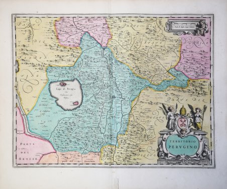 Carta geografica della provincia di Perugia tratta dall'edizione olandese dell'Atlas Major di Johannes Blaeu.La mappa descrive l'area tra Toscana e Umbria, con la città di Perugia al centro e il lago di Perugia a sinistra.Ricca di dettagli e di nomi di città. I confini provinciali sono delineati con differenti colori. Cartiglio del titolo decorativo in basso a sinistra e una scala di miglia in un secondo cartiglio in alto.Si tratta di una derivazione della carta che Giovanni Antonio Magini realizza ai prime del XVII secolo. Willem Janszoon Blaeu, avviò nel 1599 la sua attività di costruttore di globi e strumenti astronomici ad Amsterdam. Nel 1630, dopo aver comprato alcune lastre dell’atlante del Mercator da Jodocus Hondius II, fu in grado di pubblicare un volume di 60 mappe con il titolo di ' Atlantis Appendix. Cinque anni dopo, pubblicò i primi due volumi del suo atlante ' Atlas Novus ' o ' Theatrum Orbis Terrarum, ' in sei libri. Dopo la sua morte, Joan (Johannes) continuò l’opera paterna, completando l’intera serie di sei volume dell’Atlas Novus ' intorno al 1655. Fu inoltre autore di un ' Atlas Maior sive Cosmographia Blaviana, in 12 volumi pubblicati nel 1662 -72, dei quali uno dedicato all'Italia. La carta compare per la prima volta nel terzo volume del ' Theatrum. ' Secondo Koeman viene pubblicata in primis nell'edizione francese del 1640, dal titolo ' Le Theatre du Monde ou Nouvel Atlas, ' Mis en lumiere par Guillaume & Jean Blaeu. ' Troisieme partie. A Amsterdam, Chez Iean & Corneille Blaeu MDCXL. Il terzo volume del ' Theatrum ' contiene 58 carte dell'Italia e 4 della Grecia (cfr. Koeman, ' Atlas Neerlandici, pp. 160-162, Bl 35A). Le carte dell'italia derivano tutte dall'opera di Giovanni Antonio Magini. Tuttavia, sembra più probabile che il Blaeu si basi sue quelle di Hendrick Hondius e Johannes Janssonius pubblicate nel ' Theatrum Italiae in quo Eius Regna, Domina, Ducatus, Et Speciatim Illorum Provinciae, Tabulis Accuratissimis, Iam, De Novo in Lucem Editio, Describunter, Quorum Sequens Pagina Indicabit, stampato ad Amsterdam da Hendrick Hondius nel 1636. ' Sebbene pubblicate dopo la morte di Willem Janszoon Blaeu (1638) le carte spesso recano il suo imprint. Non è dato sapere se fossero tutte già pronte o se i figli Johannes e Cornelis le compilarono postume. Incisione in rame, colorazione coeva, in buono stato di conservazione. Beautiful map of the area between Tuscany and Umbria, with the city of Perugia in the center and the Perugia Lake to the left of the city. Great detail with many cities named. Provincial borders are outlined in color and mountains cover the area. Decorative title cartouche at the lower left and a distance scale in a cartouche at the top. Willem Janszoon Blaeu, started in 1599 his business as a builder of globes and astronomical instruments in Amsterdam. In 1630, after buying some plates of the Mercator atlas from Jodocus Hondius II, he was able to publish a volume of 60 maps under the title ' Atlantis Appendix. Five years later, he published the first two volumes of his atlas ' Atlas Novus ' or ' Theatrum Orbis Terrarum, in six books. After his death, Joan (Johannes) continued his father's work, completing the entire six-volume ' Atlas Novus ' series around 1655. He was also the author of an ' Atlas Maior sive Cosmographia Blaviana, in 12 volumes published in 1662 -72, one of which was devoted to Italy. The map first appears in the third volume of the Theatrum. According to Koeman it is first published in the French edition of 1640, entitled Le Theatre du Monde ou Nouvel Atlas, Mis en lumiere par Guillaume & Jean Blaeu. Troisieme partie. In Amsterdam, Chez Iean & Corneille Blaeu MDCXL. The third volume of the Theatrum contains 58 maps of Italy and 4 of Greece (see Koeman, Atlas Neerlandici, pp. 160-162, Bl 35A). The maps of Italy are all derived from the work of Giovanni Antonio Magini. However, it seems more likely that Blaeu relies on those of Hendrick Hondius and Johannes Janssonius published in Theatrum Italiae in quo Eius Regna, Domina, Ducatus, Et Speciatim Illorum Provinciae, Tabulis Accuratissimis, Iam, De Novo in Lucem Editio, Describunter, Quorum Sequens Pagina Indicabit, printed in Amsterdam by Hendrick Hondius in 1636. Although published after the death of Willem Janszoon Blaeu (1638) the maps often bear his imprint. It is not known whether they were all ready-made or if his sons Johannes and Cornelis completed them posthumously. Map taken from dutch edition of Atlas Major by Johannes Blaeu. Cfr.
