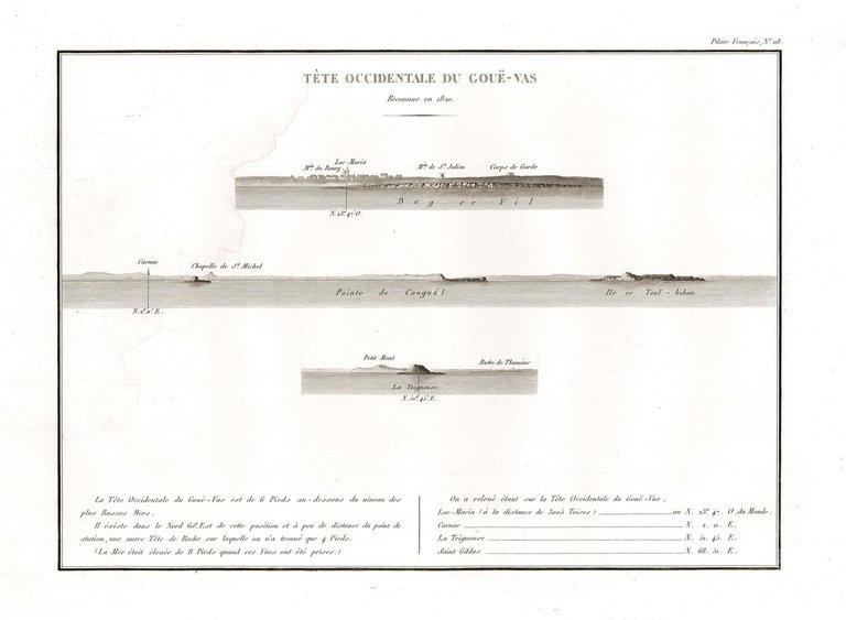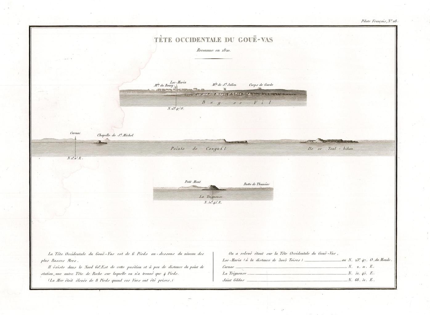 Incisione, antica ed originale, raffigurante le coste del nord-ovest della Francia nel litorale della Bretagna nei pressi di Brest. Inserita nell’opera di Beautemps Beaupré Charles François (considerato il padre della idrografia moderna) “Pilote français, (environs de Brest) / Rédigé / Par M. Beautemps Beaupré Ingénieur Hydrographe en Chef de la Marine, / Membre de l’Académie Royale des Sciences de l’Institut de France… / Publié par ordre du Roi / Sous me Ministère de Son Excellence M.le Marquis de Clermont Tonnerre /.“ Edita a [Parigi]