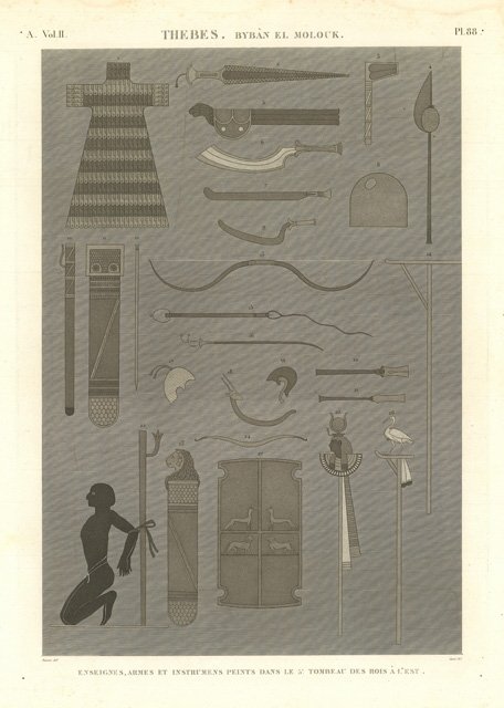Raffigurazioni di diverse armi e strumenti dipinti nelle tombe della Valle dei Re, nella Necropoli di Tebe. Tavola incisa all’acquaforte su lastra di rame, inserita nella monumentale opera Description de l’Egypte, II° edizione dal 1820-29 voluta da Luigi XVIII, importante risultato culturale dell’occupazione francese in Egitto per il periodo che va dal 1798 al 1801. Bonaparte decise di invadere queste terre per controllare le vie commerciali verso l’india ed assestare in questo modo un duro colpo all’economia britannica. Durante questa operazione, il Nostro favorì l’attività di numerosi artisti, ingegneri, matematici e naturalisti per registrare e catalogare con estrema precisione le costruzioni e i monumenti egiziani nonché la flora e la fauna. Il risultato di questo immane sforzo, che per la pubblicazione coinvolse quasi duemila tra artisti e tecnici oltre a quattrocento incisori, fu l’opera "Description de l’Egypte, ou recueil des observations et des recherches qui ont été faites en Egypte pendant l’expédition de l’armée française", che offre una globale visione scientifica dell’antico e moderno Egitto, nonché la sua storia naturale. La Description ebbe grande influenza sul movimento orientalista pittorico dell’ottocento e diede un contributo fondamentale alla diffusione dell’Egittologia. Numerosi edifici rappresentati in queste tavole sono stati completamente distrutti nel tempo