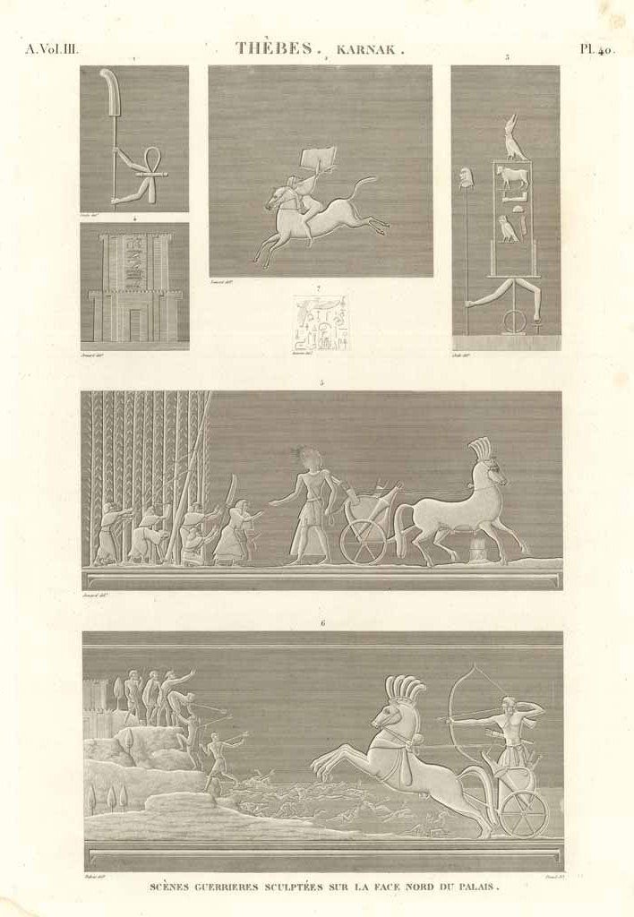 Rappresentazione di scene di guerra scolpite nel Tempio di Karnak, nel sito archeologico dell'Antica Tebe. Tavola incisa all’acquaforte su lastra di rame, inserita nella monumentale opera Description de l’Egypte, II° edizione dal 1820-29 voluta da Luigi XVIII, importante risultato culturale dell’occupazione francese in Egitto per il periodo che va dal 1798 al 1801. Bonaparte decise di invadere queste terre per controllare le vie commerciali verso l’india ed assestare in questo modo un duro colpo all’economia britannica. Durante questa operazione, il Nostro favorì l’attività di numerosi artisti, ingegneri, matematici e naturalisti per registrare e catalogare con estrema precisione le costruzioni e i monumenti egiziani nonché la flora e la fauna. Il risultato di questo immane sforzo, che per la pubblicazione coinvolse quasi duemila tra artisti e tecnici oltre a quattrocento incisori, fu l’opera "Description de l’Egypte, ou recueil des observations et des recherches qui ont été faites en Egypte pendant l’expédition de l’armée française", che offre una globale visione scientifica dell’antico e moderno Egitto, nonché la sua storia naturale. La Description ebbe grande influenza sul movimento orientalista pittorico dell’ottocento e diede un contributo fondamentale alla diffusione dell’Egittologia. Numerosi edifici rappresentati in queste tavole sono stati completamente distrutti nel tempo