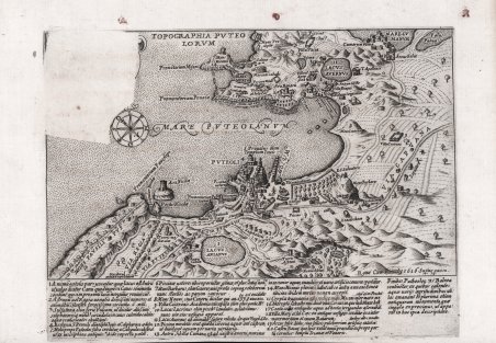 RARISSIMA EDIZIONE POSTUMA, con la dedica di Giacomo Lauro a ' Jakob Fugger of Kirchberg - in alto a sinistra - abrasa. Pianta dei Campi Flegrei tratta dalla più celebre opera di Giacomo Lauro, la Antiquae urbis splendor, edita per la prima volta nel 1612/15 in 3 parti, e quindi accresciuto nel 1628 da una quarta parte. L'ultima parte, edita dal celebre mecenate svizzero Jan Alten, contiene le vedute delle ville di Roma e dintorni. L'opera fu ristampata in seguito, dato il grande successo, da Rudolf Alten. La carta del territorio di Pozzuoli, dedicata da Lauro a ' Jakob Fugger of Kirchberg, deriva dal modello introdotto da Mario Cartaro nel 1577. “La mappa edita da Bartolomeo Grassi ed incisa da Mario Cartaro rappresenta il prototipo diretto di quasi tutte le cartografie dei Campi Flegrei fino alla metà del ‘700, quando, per i rinnovati interessi archeologici si rivisitarono quei luoghi con maggiore attenzione effettuando rilievi con nuove strumentazioni. È la prima carta archeologica dei Campi Flegrei, ricchissima di informazioni antiquarie e di grande utilità per la collocazione dei principali monumenti dell’area, sia di quelli ancora esistenti, sia delle antichità scomparse, la cui ubicazione è basata su fonti letterarie. L’opera riporta nella dedica la data del 4 ottobre 1584. Grassi ottenne il privilegio per la stampa il primo ottobre dello stesso anno, unitamente a quello per un libro sulle antichità di Pozzuoli, illustrato da tavole incise sempre dal Cartaro” (cfr. S. Bifolco, F. Ronca, ' Cartografia e topografia italiana del XVI secolo, 2018: pp. 2068-2069, Tav. 1045) La ' Antiquae urbis splendor ' di Giacomo Lauro è un’opera di grande importanza storica e archeologica che l’autore iniziò nel 1612. Il titolo intero è: ' Antiquae urbis splendor, hoc est praecipua eiusdum templa, amphitheatra, theatra, circi, naumachie, arcus triumphales, mausolea aliaque sumptuosiora aedificia, pompae item triumphalis et colossaearum imaginum descriptio; opera & industria Iacobi Lauri Romani in aes incisa atque in lucem edita. Addita est breuis quaedam et succincta imaginum explicatio in qua regum consulum imperatoruq; res gestae et rei romanae origo progressus incrementum, ac finis cu almae urbis antiquor. ac modernor. vestigior. additione utcunq; hoc insequenti anno 1630 reperiutur, et ex veteru ac recentior. historiar. monumentis clare ostenditur. Il libro ha una lunga e varia storia di pubblicazione, a partire dal 1612, anche se il lavoro di Lauro sul libro precede la sua pubblicazione di almeno diciotto anni. Il libro fu stampato per la prima volta da Giacomo Mascardi, e originariamente conteneva solo due parti, anche se nel 1615 si era allargato a una terza parte. La prima parte conteneva 37 incisioni, con una dedica al re Sigismondo III di Polonia, datata 1614, e un ritratto datato 1609 (preso in prestito da un altro libro di incisioni). La seconda parte conteneva un ritratto di Carlo Emanuele I, duca di Savoia, datato 1613, e 41 incisioni. Vale la pena notare che questi primi due libri erano entrambi dedicati alla nobiltà polacca, probabilmente a causa del fatto che Lauro aveva goduto di patrocinio dall'incisione di battaglie polacche all'inizio della sua carriera. La terza parte, aggiunta più tardi, era dedicata a Ranuccio Farnese, uno dei maggiori mecenati di Lauro più tardi nella sua vita, e conteneva 40 incisioni. Il numero di tavole incluse in ciascuna delle precedenti edizioni dell'opera di Lauro (stampate alla Camera Apostolica nel 1614 in quattro parti, e stampate di nuovo lì nel 1621 in tre parti) fu finalmente stabilito nel 1628 con l'aggiunta del quarto e ultimo libro per un totale di 166 incisioni, che è il numero generalmente accettato per quante incisioni totali Lauro produsse per quest'opera. L'edizione pubblicata da Vitale Mascardi e curata da Giovanni Alto uscì nel 1637. Alto ha aggiunto un indice finale e numerato ciascuna delle incisioni, 2-167, per quest'ultima edizione. Acq. Map of Pozzuoli taken from Giacomo Lauro's most famous work "Antiquae urbis splendor " published for the first time in 1612/15 in 3 parts, and then increased in 1628 by a fourth part. The last part, edited by Jan Alten, contains views of the villas in and around Rome. The work was later reprinted, given the great success, by Rudolf Alten. That Pozzuoli map derives from the model introduced by Mario Cartaro in 1577. Plate taken from the important ' Antiquae urbis splendor ' by Giacomo Lauro. The full title is: ' Antiquae urbis splendor, hoc est praecipua eiusdum templa, amphitheatra, theatra, circi, naumachie, arcus triumphales, mausolea aliaque sumptuosiora aedificia, pompae item triumphalis et colossaearum imaginum descriptio; opera & industria Iacobi Lauri Romani in aes incisa atque in lucem edita. Addita est breuis quaedam et succincta imaginum explicatio in qua regum consulum imperatoruq; res gestae et rei romanae origo progressus incrementum, ac finis cu almae urbis antiquor. ac modernor. vestigior. additione utcunq; hoc insequenti anno 1630 reperiutur, et ex veteru ac recentior. historiar. monumentis clare ostenditur. The book has a long and varied history of publishing, beginning in 1612, though Lauro’s work on the book predates its publishing by at least eighteen years. The book was first printed by Giacomo Mascardi, and it originally only contained two parts, though by 1615 it had expanded to a third part. The first part contained 37 engravings, with a dedication to King Sigismund III of Poland, dated 1614, and a portrait dated 1609 (borrowed from another book of engravings). The second part contained a portrait of Charles Emmanuel I, Duke of Savoy, dated 1613, and 41 engravings. It is worth noting that these first two books were both dedicated to Polish nobility, probably due to the fact that Lauro had enjoyed patronage from engraving Polish battles early in his career. The third part, added later, was dedicated to Ranuccio Farnese, one of Lauro’s greater
