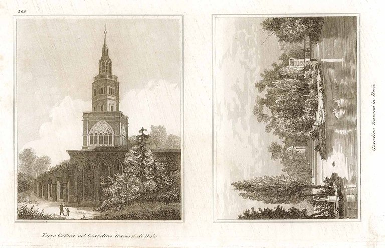 Stampa antica ed originale raffigurante due piccole vedute in unico foglio: la torre ed il laghetto del giardino Traversi di Desio. Autore: Audot edit. Luogo: Desio. Anno: 1837. Tecnica: incisione in acciaio. Dimensioni: 113x191 mm