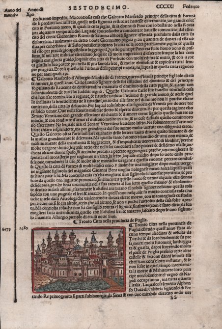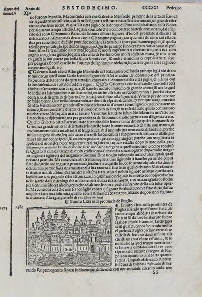 Pagina contenente una piccola veduta xilografica della città, rappresentata con molti elementi di fantasia. Foglio tratto dal celebre ' Supplementum chronicarum orbis ab initio mundi ' di Giacomo Filippo Foresti. Il ' Supplementum ' è una narrazione per annate in 15 libri contenente una sorta di storia universale del mondo dall’origine fino al 1482. Nel 1483 fu stampato per la prima volta a Venezia e dedicato alla Magnifica Comunità di Bergamo. Il ' Supplementum ' è una sorta di storia generale che si propone di raccogliere in un unico libro le notizie meritevoli di esser tramandate ai posteri, sparse fino a quel momento in disparati testi. La narrazione procede per annate, secondo un rigoroso ordine cronologico: nella prima edizione l'opera constava di quindici libri, nell'edizione del 1503 il Foresti aggiunse un sedicesimo libro contenente gli avvenimenti degli ultimi venti anni. Successivamente aggiornata più volte; complessivamente sono conosciute sei edizioni incunabolo e sei stampate nel ‘500, di cui l’ultima nel 1553. La prima edizione in italiano è stampata a Venezia nel 1535, e da questa è tratta questa pagina. Le tavole xilografiche raffiguranti le città compaiono per la prima volta nel 1513 e vengono implementate nel numero con il susseguirsi delle edizioni. Il ' Supplementum Chronicarum (in omnimoda historia novissime congesta) ha come principale fonte i ' Genealogiae deorum gentilium libri ' e il ' Chronicon ' di S. Antonino. Giacomo Filippo di Bergamo (lat. Bergomensis 1434-1520), fu eremita religioso agostiniano. Appartenente alla nobile famiglia dei conti Foresti, Jacopo entro nell'Ordine degli eremitani di S. Agostino, e fu priore a Imola e a Forlì. Xilografia, finemente colorata a mano, in ottimo stato di conservazione. Bibliografia Pianetti Elisa, ' Fra’ Jacopo Filippo Foresti nel quadro della cultura bergamasca, in “Bergomum” Bollettino della Civica Biblioteca vol.2, 1939. Page containing a small woodcut view of the city, depicted with many fantasy elements. Sheet from the famous ' Supplementum chronicarum orbis ab initio mundi ' by Giacomo Filippo Foresti. The ' Supplementum ' is a narrative for annals in 15 books containing a kind of universal history of the world from its origin to 1482. In 1483 it was first printed in Venice and dedicated to the Magnifica Comunità di Bergamo. The ' Supplementum ' is a kind of general history that aims to collect in a single book the news worthy of being handed down to posterity, scattered up to that time in disparate texts. The narrative proceeds by years, in strict chronological order: in the first edition the work consisted of fifteen books; in the 1503 edition Foresti added a sixteenth book containing the events of the last twenty years. Subsequently updated several times; a total of six incunable editions are known and six printed in the 1500s, the last of which was in 1553. The first Italian edition is printed in Venice in 1535, and this page is taken from it. The woodcut plates depicting the cities first appear in 1513 and are implemented in number as editions follow. The ' Supplementum Chronicarum (in omnimoda historia novissime congesta) has as its main source the ' Genealogiae deorum gentilium libri ' and the ' Chronicon ' of St. Antoninus. Giacomo Filippo of Bergamo (lat. ' Bergomensis 1434-1520), was an Augustinian religious hermit. A member of the noble family of Count Foresti, Jacopo entered the Order of the Hermits of St. Augustine, and was prior in Imola and Forli. Woodcut, fine later hand colour, in excellent condition. Bibliografia Pianetti Elisa, ' Fra’ Jacopo Filippo Foresti nel quadro della cultura bergamasca, in “Bergomum” Bollettino della Civica Biblioteca vol.2, 1939. Cfr.