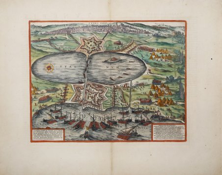 Veduta dell'antica città di Tunisi, pubblicata – per la prima volta - nel ' Civitates Orbis Terrarum, di Braun & Hogenberg, il primo atlante devoto esclusivamente alle piante e vedute delle principali città del mondo, stampato in sei volumi tra il 1572 ed il 1617, ebbe grande fortuna e diffusione, tanto che ne furono stampate diverse edizioni tradotte in latino, tedesco e francese; gli intagli dei rami sono attribuiti a Franz Hogenberg e Simon van de Noevel. Il soggetto deriva da un foglio d'occasione del 1573 stampato a Roma da Antonio Lafreri. La città è raffigurata sotto assedio: la città è vista da est, così come il Golfo di Tunisi, con la grande laguna stagnante (stagnum), oggi El Bahira, di fronte. Ai due accessi al mare si trovano le fortezze La ' Goulette e Nova Arx; la città si vede sullo sfondo. Tunisi, fondata prima del IX secolo aC, era sempre stata ambita dalle varie potenze per la sua posizione. Storicamente governata dagli Africani prima e dagli Arabi poi, solo nel 1535 passò sotto il dominio europeo, quando Carlo V riuscì a conseguire una vittoria importante sull'impero ottomano. Nel 1569 i Turchi conquistarono Tunisi sotto Kilic Ali Pasha, la persero nel 1573 contro Filippo II di Spagna per riottenerla nel 1574. Opera ' tratta dal "Theatrum praecipuarum urbium" celebre teatro delle città del Janssonius, sullo stile del "Civitates Orbis Terrarum" di Braun & Hogenberg. La raccolta, pubblicata ad Amsterdam tra il 1652 ed il 1657, contiene 500 tavole raffiguranti città di ogni parte del mondo. Contrariamente al lavoro degli acerrimi rivali Blaeu, Janssonius si servì per la realizzazione dell'opera delle lastre di precedenti cartografi ed editori. In particolare, nel 1653 egli acquisto da Abraham Hogenberg le lastre del "Civitates orbis Terrarum" che incorporò nella sua opera, ristampandole, con alcune modifiche. Per le piante delle città olandesi, ordinò delle nuove lastre basate sull'atlante che Johannes Blaeu diede alla luce nel 1649. Per molte delle opere contenute nel 5° volume, quello dedicato all'Italia e denominato "Theatrum celebriorum urbium Italiae", si servì delle lastre realizzate da Jodocus Hondius per l'opera "Italia Hodierna" del 1627. ' Incisione in rame, finemente colorata a mano in ottimo stato di conservazione. This image of Tunis shows the town under siege: the city is seen from the east, as well as the Gulf of Tunis, and the large stagnant lagoon (stagnum), today called El Bahira, in front of it. At both entrances to the sea the fortresses La Goulette and Nova Arx are found; the town is seen in the background. After an Italian broadsheet published in Rome by Antonio Lafreri in 1573. Tunis, which was founded before the 9th century BC, was always an apple of discord due to its location. Following multiple Arabic and African rulers the Europeans attempted to capture the town for the first time in 1270. Yet it wasn't until 1535 that this could be accomplished, by Charles V, who with it achieved an important victory over the Ottoman Empire; he was even able to defeat the Turk's most formidable leader, Khair ad-Din, otherwise known as Barbarossa. In 1569 the Turks captured Tunis under Kilic Ali Pasha, then lost it in 1573 to Philip II of Spain and won it back in 1574. The work is first included in the ' Civitates Orbis Terrarum, the first atlas devoted exclusively to plans and views of the world's major cities. ' This map is taken from the "Theatrum praecipuarum urbium" a townbook by Johannes Janssonius, in the style of Braun & Hogenberg's "Civitates Orbis Terrarum." The collection, published in Amsterdam between 1652 and 1657, contains 500 plates depicting cities from all parts of the world. In contrast to the work of the competitor Johannes Blaeu, Janssonius made use of plates from previous cartographers and publishers for the work. In 1653 he purchased the plates of "Civitates orbis Terrarum" from Abraham Hogenberg, which he incorporated into his work, reprinting them, with some changes. Copperplate, printed on contemporary laid paper, fine later hand colour, in very good condition. Cfr. Van der Krogt 4, 4517; Fauser, 14325; Taschen, Braun and Hogenberg, p.198.
