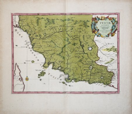 Carta storico-geografica della Tuscia pubblicata da Johannes Covens e Cornelis Mortier e tratta dall'Atlas nouveau, contenant toutes les parties su Monde, ou sont exactement remarquees les empires, monarchies, royaumes, etats, republiques, &c. Par Guillaume de l'Isle. Premier Geographe de sa Majeste. Ad Amsterdam, Chez Jean Covens & Corneille Mortier, sur le Vygendamm, circa 1740. Johannes Covens (1697-1774) è stato un editore geografico olandese con sede ad Amsterdam. È noto soprattutto per la sua collaborazione con l'editore Cornelis Mortier (1699-1783). Pierre Mortier il Vecchio (1661-1711) aveva ottenuto nel 1690 il privilegio di distribuire le opere dei geografi francesi nei Paesi Bassi. Dopo che la vedova continuò l'attività per alcuni anni, Cornelis ne assunse la direzione nel 1719. Nel 1721, Mortier si mise in società con Covens, che aveva da poco sposato la sorella di Cornelis. I due pubblicarono sotto il nome comune di Covens & Mortier. Nel 1774, alla morte del padre, Johannes Covens II (1722-1794) rilevò la quota paterna. Nel 1778, la società cambiò nome in J. Covens & Zoon, o J. Covens & figlio. L'azienda era specializzata nella pubblicazione di geografi francesi, tra cui De LIsle, Jaillot e Sanson. Pubblicarono anche atlanti, ad esempio una riedizione del 1725 dell'Atlas Major di Frederik de Wit e un atlante, con aggiunte, delle opere di Guillaume Delisle. Al suo apice, l'azienda possedeva la più grande collezione di stampe geografiche mai riunita ad Amsterdam. Acquaforte con bellissima coloritura originale, ottimo stato di conservazione. Rara. Historical/geographical map taken from the collection of maps published by Johannes Covens and Cornelis Mortier, taken from the Atlas nouveau, contenant toutes les parties su Monde, ou sont exactement remarquees les empires, monarchies, royaumes, etats, republiques, &c. Par Guillaume de l'Isle. Premier Geographe de sa Majeste. A Amsterdam, Chez Jean Covens & Corneille Mortier, sur le Vygendamm, circa 1740. Johannes Covens (1697-1774) was a Dutch geographic publisher based in Amsterdam. He is best known for his collaboration with fellow publisher Cornelis Mortier (1699-1783). Pierre Mortier the Elder (1661-1711) had obtained a privilege in 1690 to distribute the works of French geographers in the Netherlands. After his widow continued the business for several years, Cornelis took over in 1719. In 1721, Mortier forged a partnership with Covens, who had recently married Cornelis’ sister. They published under the joint name of Covens & Mortier. ' In 1774, upon the death of his father, Johannes Covens II (1722-1794) took over his father’s share. In 1778, the company changed its name to J. Covens & Zoon, or J. Covens & son. Covens II’s son, Cornelis (1764-1825), later inherited the business and brought Petrus Mortier IV back into the fold. Petrus was the great-grandson of Petrus Mortier I. From 1794, the business was called Mortier, Covens & Zoon, or Mortier, Covens, & Son. The business specialized in publishing French geographers including Deslisle, Jaillot, and Sanson. They also published atlases, for example a 1725 reissue of Frederik de Wit’s ' Atlas Major ' and an atlas, with additions, from the works of Guillaume Delisle. There were also Covens & Mortier pocket atlases and town atlases. The company profited from acquiring plates from other geographers as well. For example, the purchased Pieter van der Aa’s plates in 1730. Finally, they also compiled a few maps in house. At their height, they had the largest collection of geographic prints ever assembled in Amsterdam. Copperplate with fine original colouring, very good condition. Rare. Cfr.
