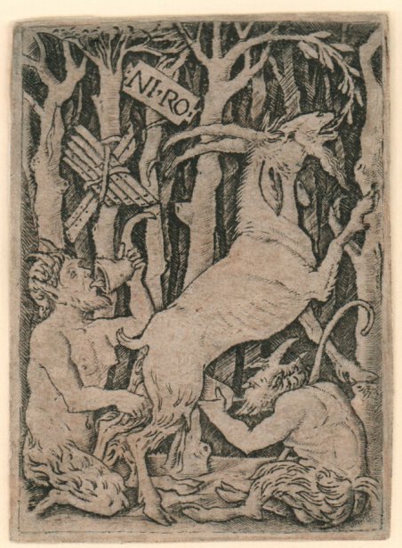 Bulino, 1500-1510 circa, firmata sulla tavoletta appesa all’albero: “NI: RO”.Buona prova, stampata su carta vergata coeva, in ottime condizioni.Questa è una delle sedici opere incise in stile niello da Nicoletto, tutte di piccole dimensioni ed eseguite con sfondi scuri. Nessuna di queste, tuttavia, può effettivamente essere considerata un vero niello, poiché la presenza di lettere non invertite è un chiaro segno che le lastre fin dall'inizio fossero destinate alla stampa.Le stampe in stile niello sono notoriamente difficili da datare, ed è probabile che queste incisioni siano state progettate in diversi momenti della carriera di Nicoletto, anche se alcune sembrano essere abbastanza precoci. Attivo tra la fine del Quattrocento e il terzo decennio del Cinquecento, fu il più prolifico tra gli incisori italiani delle origini. Dopo gli esordi in ambito emiliano, in cui appaiono chiaramente visibili le relazioni che Nicoletto intrattenne con la cultura ferrarese e con la bottega bolognese di Francesco Francia, dal 1487 l’incisore è documentato a Padova per circa un ventennio, ebbe modo di maturare, sotto l’influsso della scuola di Andrea Mantegna, una visione libera ed eccentrica dell’antico, è da ricondurre la celebre incisione raffigurante ' Quattro donne ignude, nota in tre esemplari e firmata e datata 1500. Nel 1507, Rosex si trasferì a Roma. La produzione capitolina si caratterizza per un rinnovato interesse verso il mondo classico, testimoniato dalle stampe raffiguranti ' Apelle, la ' Statua equestre di Marc’Aurelio ' e la serie dei ' Pannelli ornamentali, in cui la decorazione a grottesca è trattata come soggetto autonomo. È probabile che il soggiorno romano fosse di breve durata, dal momento che nel 1510 Nicoletto è documentato a lavoro nel palazzo ducale di Modena. L’attività degli ultimi anni, in cui è ravvisabile la conoscenza delle incisioni di Marcantonio Raimondi e di Giulio Campagnola, appare riconoscibile per la preponderanza dell’elemento architettonico e per la nuova centralità della figura umana nello spazio. Anche il segno incisorio è contraddistinto da una maggiore omogeneità e da ombreggiature più felici. Engraving, 1500 – 1510 circa, signed on a tablet hangin from a tree: “NI:RO”.Good impression, printed on contemporary laid paper, in excellent condition.This is one of sixteen niello-manner prints by Nicoletto, with dark backgrounds and small dimensions. None of them, however, can actually have been a true niello, for the presence of unreversed letters is a clear sign that the plates were intended for printing from the very start.Niello-manner prints are notoriously difficult to date, and it is likely that these engravings were designed at different points in Nicoletto’s career, though a number of them seem to be fairly early. Active between the end of the fifteenth century and the third decade of the sixteenth century, he was the most prolific of the early Italian engravers. After the beginnings in Emilia, in which appear clearly visible relations that Nicoletto entertained with the culture of Ferrara and with the workshop of Francesco Francia in Bologna, from 1487 the engraver is documented in Padua for about twenty years, he had the opportunity to mature, under the influence of the school of Andrea Mantegna, a free and eccentric vision of the ancient, is to be attributed the famous engraving depicting Four naked women, known in three copies and signed and dated 1500. In 1507, Rosex moved to Rome. The Capitoline production is characterized by a renewed interest in the classical world, as evidenced by prints depicting Apelles, the Equestrian Statue of Marc'Aurelius and the series of ornamental panels, in which the grotesque decoration is treated as an independent subject. It is likely that the Roman stay was of short duration, since in 1510 Nicoletto is documented at work in the ducal palace of Modena. The activity of the last years, in which is recognizable the knowledge of the engravings of Marcantonio Raimondi and Giulio Campagnola, is recognizable for the preponderance of the architectural element and for the new centrality of the human figure in the space. Also the engraving sign is characterized by a greater homogeneity and by better shading. Cfr. TIB 2508.077.