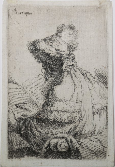 Acquaforte, 1650 circa, firmata in lastra in alto a sinistra con il monogramma GB, seguito da CASTILONE. Stato unico. L’incisione viene comunemente attribuita al Castiglione per la presenza e la composizione della firma dell’artista, che si ritrova su altri suoi lavori di sicura attribuzione. Anche la posizione della firma è analoga. L’unico dubbio è costituito dalle forti analogie che questa incisione presenta con una serie di quattro lavori non incisi da Castiglione (TIB, .097-100). Tuttavia, questo ritratto riconduce stilisticamente alle due serie di Ritratti all’orientale del Castiglione, incisi ed ispirati alla maniera di Rembrandt. Eccellente prova, ricca di toni, impressa su carta vergata coeva, completa oltre la linea marginale, con margini bianchi di circa 0.8 mm per lato, filigrana parziale (in alto a destra) non identificabile, in ottimo stato di conservazione. Stampa rarissima; Bellini elenca come solo esemplare istituzionale italiano quello conservato alla Biblioteca Ambrosiana. Bibliografia P. Bellini in TIB (1985), 4602.069. Etching, 1650 circa, signed at upper left with monogram GB, followed by the surname CASTILONE. The only state. This etching is attribued to Catiglione for the presence of the artist’s last name, composed in the same way as his monogram and signature in other works, and similar to the artist’s signature included in his two portrait series. Furthermore, the placement of the signature is analogous. A possible contradiction to this attribution is presented by the strong similarities this etching displays to a series of four works not etched by Castiglione (TIB, 097-100). Excellent example, printed on contemporary laid paper, white margins of 0,8 mm circa, with partial and unreadable watermark, in very good condition. A very rare work; Paolo Bellini describes only 5 institutional examples. Bibliografia P. Bellini in TIB (1985), 4602.069. Cfr.