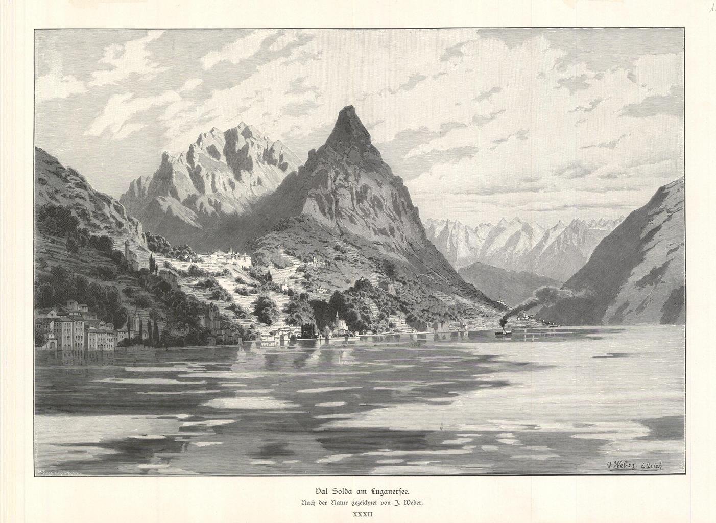 Veduta, antica ed originale, della Val Solda vista dal Lago di Lugano. Autore: Weber J. J. Luogo: Lago di Lugano - Canton Ticino. Anno: fine '800. Tecnica: xilografia. Dimensioni: 236x347 mm