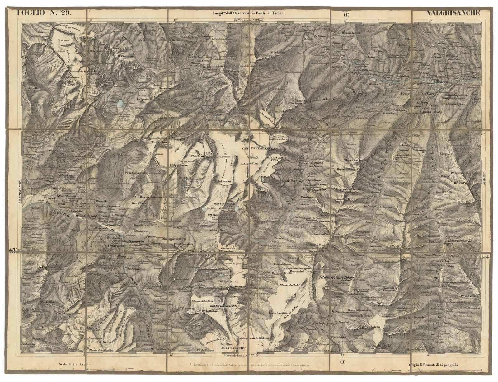 Carta raffigurante il territorio . Foglio C1 facente parte della grande carta murale (mm 7000x7700) " Gran Carta degli Stati Sardi / in Terraferma / divisa in fogli 91 alla scala di 1/50,000". Pubblicata dal Corpo Reale di Stato Maggiore. Telata e piegata editorialmente