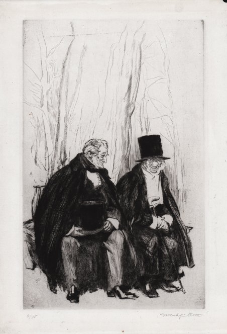 Puntasecca a inchiostro nero su carta vergata color crema, 1926, firmata in basso a sinistra: G. Firmato, a matita, in basso a destra: Frank Gillet. Bellissima prova, in ottimo stato di conservazione. Edward Frank Gillet, spesso accreditato come Frank Gillett, è stato un artista e illustratore britannico. Gillett lavorò a penna e inchiostro, pastello, acquerello e olio e fu notato come un abile caricaturista. Era ispirato dalla vita rurale di Norfolk e il suo lavoro spesso coinvolgeva lo sport, in particolare la caccia alla volpe e la caccia alla lepre. Il suo lavoro è stato esposto dalla Royal Academy of Arts e dalla Walker Art Gallery ed è detenuto dal British Museum e dal Victoria and Albert Museum. Drypoint in black ink on cream laid paper, 1926, signed, lower left: G. Signed, in pencil, lower right: Frank Gillet. A fine impression, very good condition. Edward Frank Gillett often credited as Frank Gillett, was a British artist and illustrator. He worked in pen and ink, pastel, watercolour, and oil. Gillett worked in pen and ink, pastel, watercolour, and oil and was noted as a skillful caricaturist. He was inspired by Norfolk's rural life and his work often involved sport, particularly fox-hunting and hare-coursing. His work has been exhibited by the Royal Academy of Arts and the Walker Art Gallery and is held by the British Museum and the Victoria and Albert Museum. Cfr.