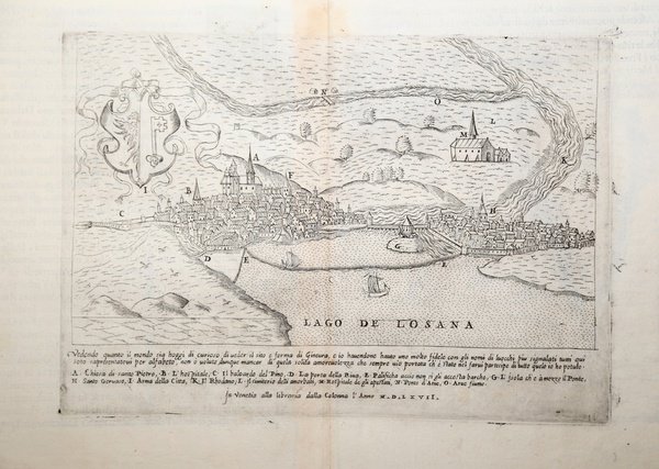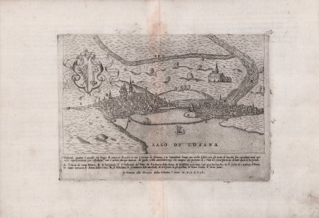 Rara pianta prospettica della città di Paolo Forlani. Esemplare della tiratura di Bolognino Zaltieri, con il testo descrittivo al verso di Giulio Ballino, stampata a Venezia nel 1569. “A sinistra è disegnato lo stemma della città di Ginevra. Nel margine inferiore si legge: Vedendo quanto il mondo sia hoggi di curioso di veder il sito e forma di Ginevra, e io havendone hauto uno molto fidele con gli nomi di luocchi più signalati tutti qui soto rapresentatovi per alfabeto, non ò voluto dunque mancar di quela solita amorevolezza che sempre viò portata ch’è stato nel farvi partecipe di tutto quelo io ho potuto. Segue una legenda alfabetica di 13 rimandi (A-O) e l’imprint editoriale: Jn Venetia alla libraria dalla Colonna l’Anno M.D.LXVII. Veduta prospettica di Ginevra, attribuita a Paolo Forlani per la presenza dell’indirizzo alla libraria dalla Colonna che identifica la sua tipografia. L’opera è inserita in tutti i cinque gli esemplari noti della raccolta Il primo libro delle citta et fortezze del mondo, che contiene lastre di Forlani e Zenoi. Si trova altresì inserita anche in atlanti fattizi di grande formato, come quelli conservati alla Biblioteca Marucelliana e alla Biblioteca Nazionale di Firenze, alla Biblioteca Nazionale di Roma, all’Archivio di Stato di Torino e alla Biblioteca Reale di Madrid. Il modello della veduta è da individuarsi nella silografia di Guillaume Guéroult pubblicata nel Premier livre des figures et pourtraitz de villes edito da Balthazar Arnoullet nel 1552 a Lione. La tavola è ristampata, inalterata, da Bolognino Zaltieri in due diverse edizioni dell’opera De’ disegni delle più illustri citta, et fortezze del mondo di Giulio Ballino, entrambe pubblicate a Venezia nel 1569. Non si conoscono varianti di lastra, ma le tirature dello Zaltieri presentano un testo descrittivo al verso.” (cfr. Cartografia e topografia italiana del XVI secolo, p. 951). Paolo Forlani, nativo di Verona, nel 1560 aprì una propria bottega calcografica a Venezia, Al segno del pozzo, come risulta da alcune sue opere. Dal 1566 è attivo a Merzaria al segno della colonna e dal 1569 a Merzaria al segno della nave. Forlani ebbe rapporti commerciali con i maggiori editori di materiale cartografico del tempo, tra questi Antonio Lafreri, la famiglia Bertelli ed altri. Oltre ad essere un talentuoso incisore, era altresì rapido nell’esecuzione, qualità che gli consentì di lavorare contemporaneamente per editori diversi, e di eseguire una gran quantità di lavori. Woodward attribuisce a Forlani circa cento opere, di cui la maggior parte però non sono firmate. Tra il 1560 e il 1567, Forlani collaborò con Ferrando Bertelli, per cui incise una decina di rami, con Camocio, Bolognino Zaltieri e con Claudio Duchetti, per il quale incise alcune mappe. Per la sua attività professionale fu però molto importante e preziosa la collaborazione con Giacomo Gastaldi per il quale incise tredici carte. Nel 1567 Forlani pubblicava e commerciava la sua opera Il primo libro delle città et fortezze principali del mondo, i cui rami passarono poi a Bolognino Zaltieri. È probabile che il Forlani sia morto durante la peste che si diffuse a Venezia dal 1575. Bellissima prova, impressa su carta vergata coeva, testo descrittivo al verso, consueta piega centrale, in ottimo stato di conservazione. Bibliografia S. Bifolco, F. Ronca, ' Cartografia e topografia italiana del XVI secolo, tav. 361; ' S. Bifolco, Città e Fortezze Principali del Mondo. Le prime raccolte italiane di cartografia urbana e gli isolari del XVI secolo, in “Cartografia e topografia italiana del XVI secolo”, pp. 137-152; Albert Ganado, The Forlani-Zenoi town books of 1567. A description and analysis, in “Florilegium Cartographicum. Beiträge zur Kartographiegeschichte und Vedutenkunde des 16. Bis 18. Jahrhunderts”, a cura di Peter H. Köhl e Peter H. Meurer, Lipsia, 1993, pp. 21-34; Béla Szalai, (adattamento e traduzione inglese Ivan Matkovi?. Rare perspective view of the city by Paolo Forlani, 1567. Example issued by Bolognino Zaltieri, with descriptive text on verso by Giulio Ballino, printed in Venice in 1569. “A sinistra è disegnato lo stemma della città di Ginevra. Nel margine inferiore si legge: Vedendo quanto il mondo sia hoggi di curioso di veder il sito e forma di Ginevra, e io havendone hauto uno molto fidele con gli nomi di luocchi più signalati tutti qui soto rapresentatovi per alfabeto, non ò voluto dunque mancar di quela solita amorevolezza che sempre viò portata ch’è stato nel farvi partecipe di tutto quelo io ho potuto. Segue una legenda alfabetica di 13 rimandi (A-O) e l’imprint editoriale: Jn Venetia alla libraria dalla Colonna l’Anno M.D.LXVII. Veduta prospettica di Ginevra, attribuita a Paolo Forlani per la presenza dell’indirizzo alla libraria dalla Colonna che identifica la sua tipografia. L’opera è inserita in tutti i cinque gli esemplari noti della raccolta Il primo libro delle citta et fortezze del mondo, che contiene lastre di Forlani e Zenoi. Si trova altresì inserita anche in atlanti fattizi di grande formato, come quelli conservati alla Biblioteca Marucelliana e alla Biblioteca Nazionale di Firenze, alla Biblioteca Nazionale di Roma, all’Archivio di Stato di Torino e alla Biblioteca Reale di Madrid. Il modello della veduta è da individuarsi nella silografia di Guillaume Guéroult pubblicata nel Premier livre des figures et pourtraitz de villes edito da Balthazar Arnoullet nel 1552 a Lione. La tavola è ristampata, inalterata, da Bolognino Zaltieri in due diverse edizioni dell’opera De’ disegni delle più illustri citta, et fortezze del mondo di Giulio Ballino, entrambe pubblicate a Venezia nel 1569. Non si conoscono varianti di lastra, ma le tirature dello Zaltieri presentano un testo descrittivo al verso.” (cfr. Cartografia e topografia italiana del XVI secolo, p. 951). Paolo Forlani, a native of Verona, opened his own chalcographic workshop in Venice, A