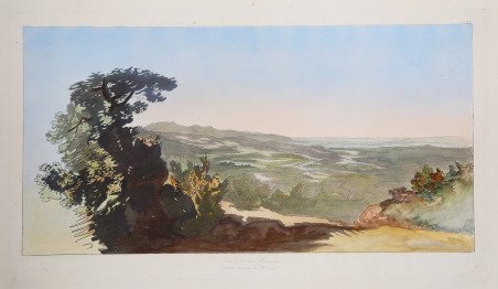 Veduta panoramica della piana di Follonica presa da Massa, tratta dal Viaggio Pittorico nelle Maremme Toscane e all'Isola dell'Elba disegnato da Carlo Muller Pittore Paesista Svizzero. Inciso e pubblicato da Fortunato De Fournier. Con opportune illustrazioni ed alcuni cenni sulla vita di questo celebre artista in italiano e in francese. Firenze, 1835. ' Acquatinta finemente colorata a mano, in ottimo stato di conservazione. Rarissima. ' Panoramic view of the plain of Follonica, taken from Viaggio Pittorico nelle Maremme Toscane e all'Isola dell'Elba disegnato da Carlo Muller Pittore Paesista Svizzero. Inciso e pubblicato da Fortunato De Fournier. Con opportune illustrazioni ed alcuni cenni sulla vita di questo celebre artista in italiano e in francese. Florence, 1835. ' Aquatint finely colored by hand, in excellent condition. Very rare. Cfr.