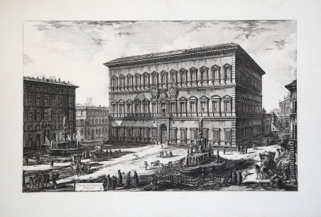 Acquaforte e bulino, 1773 circa, firmata in lastra in basso. Contemporanea tiratura “romana” della lastra, esemplare nel primo stato di tre descritto da Hind. Magnifica prova, impressa su carta vergata coeva priva di filigrana, con pieni margini, in perfetto stato di conservazione. Della serie ' Vedute di Roma. L’opera consiste in 135 lastre prodotte individualmente dal Piranesi per almeno 30 anni, da circa il 1745, fino alla data della sua morte. All’opera sono aggiunte poi due vedute realizzate dal figlio Francesco. Per la prima volta furono edite dall’editore Giovanni Bouchard nel 1751 (34 lastre), successivamente dallo stesso Piranesi editore a ' Strada Felice ' prima e ' Palazzo Tomati ' poi (indirizzi che appaiono su molte tavole), fino alla stesura definitiva composta da 137 lastre. Successivamente alla morte dell’autore le matrici furono ereditate dal figlio Francesco, che ne curò la pubblicazione prima nella capitale - le cosiddette tirature “postume romane” - e successivamente a Parigi, dove furono stampate tre edizioni – la cosiddetta “prima di Parigi”, una intermedia (entrambe su carta vergata) e quella curata dall’editore Firmin Didot, la prima su carta senza vergelle, dove le tavole presentano l’aggiunta di un numero arabo ordinale. Tutte le tirature parigine sono piuttosto modeste in qualità, lontane da come il Piranesi le aveva pensate e concepite. Le lastre furono poi acquisite dalla Calcografia Camerale, poi Calcografia Nazionale, oggi Istituto Centrale per la Grafica, dove sono tuttora conservate. Bibliografia Arthur M. Hind, ' Giovanni Battista Piranesi, A critical study ' (1922), n. 107, I/III; H. Focillon, ' Giovanni Battista Piranesi ' (1918), n. 828. ' Etching and engraving, 1773 circa, signed on plate. Example of the first state of three described by Hind, from the contemporary Roman Edition. A very good impression, printed on contemporary laid paper without watermark, with margins, in good condition. View taken from Piranesi’s ' Vedute di Roma. The whole work consists of 135 plates which have been individually produced by Piranesi along 30 years, from 1745 circa until his death. Two more works have been subsequently added, two plates by his son Francesco. They have been printed for the first time in 1751 (34 plates) by the editor Giovanni Bouchard, afterwards by Piranesi himself, publisher first in ' Strada Felice ' an the in ' Palazzo Tomati, imprint that can be found in mostly of the plates), until the final edition of 137 plates. After Piranesi's death, his son Francesco inherited the plates, editing them first in Rome and then in Paris, where three editions were printed - the so-called "first Paris edition", an intermediate one (both on laid paper) and the one edited by the publisher Firmin Didot, the first on wove paper, where the plates have an Arabic ordinal number added. All Parisi issues are rather modest in quality, far from how Piranesi had thought and conceived them. The plates were then acquired by the Calcografia Camerale, then Calcografia Nazionale, today Istituto Centrale per la Grafica, where they are still kept. Bibliografia Arthur M. Hind, ' Giovanni Battista Piranesi, A critical study ' (1922), n. 107, I/III; H. Focillon, ' Giovanni Battista Piranesi ' (1918), n. 828. ' Cfr.