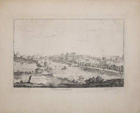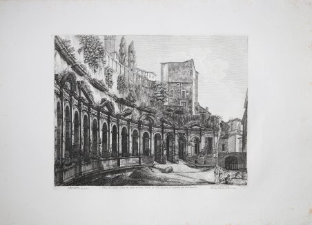 LE ANTICHITA ROMANE Tavola tratta dalla serie delle Antichità Romane, composta di 101 tavole, che viene realizzata con il ricavato della e vendita dei rami della Raccolta di cinquanta principali vedute di antichità tratte da scavi fatti in Roma in questi ultimi tempi divise in 40 vedute, edita nel 1817. Con quest’opera, per il numero delle tavole e per il formato prescelto, di grandi dimensioni, l’incisore vuole affermarsi come figura di primo piano nel mondo artistico romano. In quest’opera Rossini si cimenta in un diretto confronto con il suo predecessore G. B. Piranesi che costituisce un punto di riferimento per un incisore di vedute antiche per quanto riguarda l’originalità e l’ampiezza della riproduzione. Il Rossini, oltre a sottolineare la sua influenza nella scelta del titolo e di alcune didascalie, usa frequentemente le medesime inquadrature e identici punti di vista del maestro veneziano. Altro elemento riconducibile a Piranesi è l’uso della luce e dei forti contrasti chiaroscurali. La volontà di voler animare le vedute, restituendo il monumento al suo contesto storico e la propria inadeguatezza nel campo della figura, porta Rossini ad una collaborazione con Bartolomeo Pinelli, incisore romano, interprete e illustratore del costume e della vita popolare; a cui si devono le figure e i gruppi caratteristici che corredano le vedute. Pinelli, in alcuni casi, riprende i motivi tratti dalle sue precedenti raccolte di Costumi pittoreschi romani. ' Acquaforte, impressa su carta coeva, in ottimo stato di conservazione. ROMAN ANTIQUITIES A nice view taken from the Antichità Romane, set of 101 plates, realized with the proceeds of the sale of the plates used for Raccolta di cinquanta principali vedute di antichità tratte dai scavi fatti in Roma in questi ultimi tempi […], published in 1817. This is the work with which the artist wanted to become one of the most important artists in the Roman cultural life; we can state that if we consider the size of the work and the subject he choose. In this work Rossini tested himself with his predecessor, G. B. Piranesi, who was considered as a point of reference when it came to ancient views and originality. Rossini, was deeply influenced by Piranesi, as it can be seen in the title, the legends, the same points of views and framing. Another important element he took from Piranesi is the use of light and the contrast of chiaroscuro. In these plates Rossini reached the higher mastery of the technique, realizing also extremely particular framings and a new and complex organization of the space. In the plates quite common is the diagonal view of the subject, which gave him the possibility to elaborate more the chiaroscuro. The will to give life to his views, the reinstatement of the monuments to their historic context and the fact that he was not good with figures, brought Rossini to start a partnership with Bartolomeo Pinelli, Roman engraver and costume illustrator of daily life. He was the one who realized the figures of Rossini’s views. Sometimes Pinelli took the subjects from his previous collection Costumi pittoreschi romani. ' Etching, printed on contemporary paper, in very good condition. Cfr. Luigi Rossini incisore. Vedute di roma 1817 - 1850, catalogo della mostra a cura di L. Gavazzi, M. E. Tottoni, Roma Palazzo Braschi, 7 aprile - 15 luglio 1982. Roma