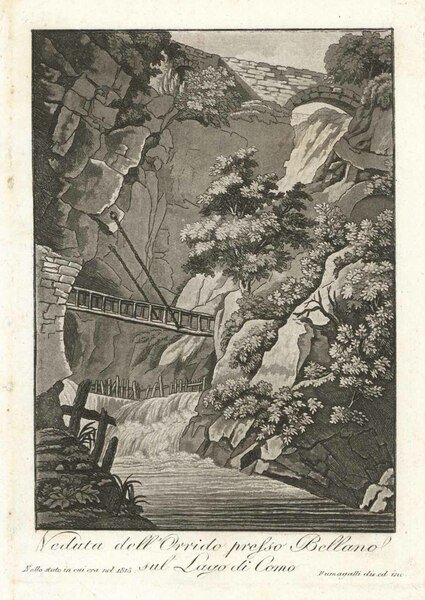 Graziosa veduta dell'Orrido di Bellano. Stampa autentica incisa all'acquatinta inserita nell'opera "Itinéraire de l'Europe par francois Gandini." Quarta edizione edita e stampata a Milano da l'Imprimerie Manini e Rivolta