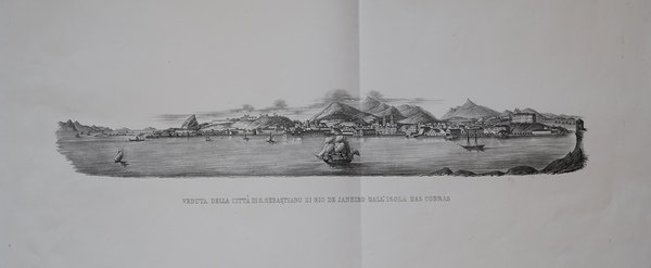 Splendida veduta pubblicata nella Guida generale / della / navigazione per le coste settentrionali ed orientali / dell'America del Sul dal Rio della Plata al Parà…OPERA CORREDATA / DI DISEGNI, TAVOLE, VEDUTE DE' PRINCIPALI ANCORAGGI, DELLE COSTE E DELLE ISOLE DELL'ATLANTICO / E D'UNA COLLEZIONE / delle migliori e più recenti piante de' porti, delle rade e degli atterraggi / per facilitare la navigazione delle coste e de' principali fiumi[…]. L'opera è il resoconto di un viaggio verso il Brasile, effettuato nel 1844 dal capitano di fregata Eugenio Rodriguez della Marina napoletana; si compone di due volumi e di un atlante, stampati a Napoli presso la Reale Tipografia Militare nel 1854 e nel 1857 (l'atlante). Le vedute, non firmate, sono attribuibili a Federico Gatti e Gaetano Dura, celebrati disegnatori dell'Officio Topografico di Napoli - presso il quale furono incise le carte dell'atlante. Litografia, completa di ampli margini, in ottimo stato di conservazione. Beautiful large view, published in Guida generale / della / navigazione per le coste settentrionali ed orientali / dell'America del Sul dal Rio della Plata al Parà…OPERA CORREDATA / DI DISEGNI, TAVOLE, VEDUTE DE' PRINCIPALI ANCORAGGI, DELLE COSTE E DELLE ISOLE DELL'ATLANTICO / E D'UNA COLLEZIONE / delle migliori e più recenti piante de' porti, delle rade e degli atterraggi / per facilitare la navigazione delle coste e de' principali fiumi[…]. The work is the report of a voyage to Brazil, carried out in 1844 by Eugenio Rodriguez, Captain of the Neapolitan Navy. The work includes two volumes and an atlas, printed in Naples, Royal Military Typography, in 1854 and in 1857 (the atlas). The maps of the Atlas, as well as the views, were engraved at the Topographical Office of Naples. In particular, the views are attribued to Federico Gatti and Gaetano Dura, designers of the Office itself. Lithography, complete with wide margins, in excellent condition. Cfr.