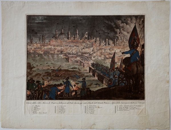 Rara veduta prospettiva della città, presa dal ponte San Giorgio, raffigurata durante l'assedio del 1796, iniziato da Napoleone Bonaparte, contro la guarnigione astriaca che si arrese nel febbraio dell'anno seguente. In basso, una rubrica con 22 rimandi ai luoghi principali riportato. L'intento principale dell'autore è la rappresentazione dell'assedio, illustrato in modo vivace e movimentato, per cui la veduta della città sullo sfondo è abbastanza approssimativa. Oltre alla cupola di S. Andrea, non sono riconoscibili le numerose architetture emergenti, nel tipico stile della veduta tedesca del periodo inaugurata da F. B. Werner.Acquaforte e acquatinata a colori, con coloritura coeva, alcuni strappi restaurati nel margine inferiore, per il resto in ottime condizioni. A rare view of the city, taken from the San Giorgio's Bridge, shows the siege of 1796, begun by Napoleone Bonaparte, against the Austrian that surrendered in February of the following year. Cfr. Farrari, Mantova nelle stampe, p. 91, 113.
