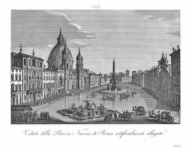 Veduta della Piazza Navona di Roma artificialmente allagata