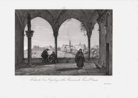 Veduta pubblicata nel noto ' Atlante illustrativo, ossia Raccolta dei principali monumenti italiani antichi, del Medio evo e moderni, e di alcune vedute pittoriche… ' di Attilio Zuccagni-Orlandini, edito in 3 tomi nel 1845 a Firenze, per servire di corredo alla ' Corografia fisica, storica e statistica dell'Italia…, opera in 12 volumi, pubblicati dal 1837 al 1845, corredata - oltre che dall'Atlante illustrativo ' sopra descritto - anche da un ' Atlante geografico degli Stati italiani, ' in due tomi. Attilio Zuccagni Orlandini (1784-1872) nacque a Fiesole con il nome di Giuseppe Orlandini. In seguito all’adozione da parte del facoltoso zio materno Attilio Zuccagni (1754-1807), botanico e georgofilo, assunse il nome di Attilio Zuccagni Orlandini. La sua più importante opera è la relazione geografico-cartografica di tutti gli Stati preunitari italiani, la grandiosa ' Corografia fisica, storica e statistica dell’Italia e delle sue Isole ' (Firenze 1835-1845), in dodici volumi per diciannove tomi, con un volume introduttivo sull’intera penisola italiana. L’opera costituì la summa delle centinaia di opere geografiche generali, regionali e locali allora disponibili e presentava, per ogni Stato preunitario, la trattazione fisica, storica, topografica e un inquadramento statistico. Nel 1844-45, la ' Corografia ' fu arricchita con cinque volumi di cartografie, vedute e altre illustrazioni di luoghi e monumenti: ' Atlante geografico degli Stati italiani delineato sopra le migliori e più moderne mappe ' (due volumi con 144 tavole inclusa la grande carta della penisola in 15 fogli) e ' Atlante illustrativo ossia raccolta dei principali monumenti italiani antichi, del medio evo e moderni e di alcune vedute pittoriche ' (tre volumi con 413 illustrazioni, stampate su 269 fogli). Le tavole furono incise, sempre a Firenze, in due apposite officine, da quattro valenti artisti lombardi (Vittorio Angeli, Giacinto Maina, Pietro Manzoni e Giuseppe Pozzi). Soprattutto il primo dei due atlanti rappresenta, ancora oggi, una pietra miliare nella storia della cartografia e dell’iconografia geografica italiana. Fu veramente ‘un’ardua impresa’, dal momento che spesso mancavano ancora (come, ad esempio, per il ' Ducato di Lucca ' e lo ' Stato Pontificio) prodotti cartografici compiutamente geometrici. I due prodotti furono presentati ai Georgofili nel 1843 e nel 1844, insieme alla mappa della Repubblica di San Marino. L’opera si rivelò oltremodo costosa e non ottenne il successo commerciale sperato, ma servì da base per tante altre iniziative editoriali successive che vi attinsero, talora senza neppure rispettarne i diritti d’autore. ' Incisione su rame all'acquaforte, in ottimo stato di conservazione. ' Bibliografia: Anna Guarducci - ' Dizionario Biografico degli Italiani ' - Volume 100 (2020). View published in the famous ' Atlante illustrativo, ossia Raccolta dei principali monumenti italiani antichi, del Medio evo e moderni, e di alcune vedute pittoriche. di Attilio Zuccagni-Orlandini, published in 3 volumes in Florence, 1845, to accompany the ' Corografia fisica, storica e statistica dell'Italia., a work in 12 volumes, published from 1837 to 1845, accompanied - in addition to the Atlante illustrativo described above - also by a ' Atlante geografico degli Stati italiani, in two volumes. Attilio Zuccagni Orlandini (1784-1872) was born in Fiesole under the name of Giuseppe Orlandini. Following adoption by his wealthy maternal uncle Attilio Zuccagni (1754-1807), a botanist and georgofile, he took the name Attilio Zuccagni Orlandini. His most important work is the geographic-cartographic report of all the pre-unification Italian states, the great ' Corografia fisica, storica e statistica dell'Italia e delle sue Isole ' (Florence 1835-1845), in twelve volumes for nineteen tomes, with an introductory volume on the entire Italian peninsula. The work constituted the sum of hundreds of general, regional and local geographic works then available and presented, for each pre-unification state, the physical, historical, topographical and statistical framework. In 1844-45, the ' Corografia ' was enriched with five volumes of maps, views and other illustrations of places and monuments: ' Atlante geografico degli Stati italiani delineato sopra le migliori e più moderne mappe ' (two volumes with 144 plates including the large map of the peninsula in 15 sheets) and ' Atlante illustrativo ossia raccolta dei principali monumenti italiani antichi, del medio evo e moderni e di alcune vedute pittoriche ' (three volumes with 413 illustrations, printed on 269 sheets). The plates were engraved, again in Florence, in two special workshops, by four talented Lombard artists (Vittorio Angeli, Giacinto Maina, Pietro Manzoni and Giuseppe Pozzi). Especially the first of the two atlases represents, even today, a milestone in the history of cartography and Italian geographic iconography. It was truly 'an arduous undertaking', since cartographic products were often still lacking (as, for example, for the Duchy of Lucca and the Papal States) fully geometric. The two products were presented to the Georgofili in 1843 and 1844, along with the map of the Republic of San Marino. The work proved to be very expensive and did not achieve the commercial success hoped for, but served as a basis for many other subsequent publishing initiatives that drew on it, sometimes without even respecting the copyright. ' Etching, in excellent condition. ' Literature: Anna Guarducci - ' Dizionario Biografico degli Italiani ' - Volume 100 (2020). Cfr.