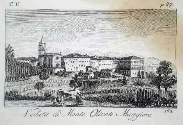 Stampa antica ed originale con veduta panoramica della cittadina. Autore: Verico Antonio. Luogo: Monte oliveto M. - SI. Anno: 1827. Tecnica: incisione in rame. Dimensioni: 55x95 mm