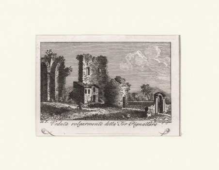 Veduta tratta dalla celebre Raccolta di num. 320 Vedute sì antiche, che moderne della città di Roma. …Incise a bulino in N. 80 rami, In Roma Nella Calcografia di Agapito Franzetti a Torsanguigna Col Permesso. ' L’opera si compone di un frontespizio calcografico e di 80 tavole numerate, ognuna composta da quattro vedute. Viene stampata senza data; molti repertori la datano intorno al 1790 circa, forse perché stampata su carta vergata. Una datazione intorno al 1800 ci sembra tuttavia più plausibile. ' Agapito Franzetti, calcografo attivo a Roma con bottega tra via del Corso e Torsanguigna, è noto per le sue piccole incisioni di veduta che servivano spesso come biglietti da visita. Tutte contengono, infatti, una linea in basso, dove si poteva apporre il proprio nome ad inchiostro. Come indicato nel titolo, le vedute raffigurano sia monumenti e antiche rovine che vedute “moderne”, con piazze, chiese e ville. Ciascuna tavola reca, in basso al centro, il nome dell’incisore. Gli artisti coinvolti sono sei: Jean-Jerome Baugean; Antonio Giuseppe Barbazza; Giovanni Battista Cipriani; Francesco Morelli; Antonio Poretta e Domenico Pronti. Molte delle vedute derivano dalla celebre opera di Giuseppe Vasi, Delle magnificenze di Roma antica e moderna. Pubblicata in 10 volumi dal 1747 al 1761, l’opera presenta 238 incisioni in rame, ciascuna incisione con testo narrativo che fornisce informazioni storiche e documentarie. ' Acquaforte, in buono stato di conservazione. ' Bibliografia: A. Bertarelli, H. Prior, Il biglietto da visita italiano. Cintributo alla storia del costume e dell'incisione nel secolo XVII, Bergamo 1911, p. 162. View of the city printed in Rome by the publisher Agapito Franzetti. Taken from Raccolta di num. 320 Vedute sì antiche, che moderne della città di Roma. …Incise a bulino in N. 80 rami, In Roma Nella Calcografia di Agapito Franzetti a Torsanguigna Col Permesso. ' The work consists of an intaglio frontispiece and 80 numbered plates, each consisting of four views. It is printed without date; many repertories date it around 1790, perhaps because it was printed on laid paper. A date around 1800 seems more plausible. Franzetti, a chalcographer working in Rome with a workshop between Via del Corso and Torsanguigna, is known for his small engravings of views that were often used as business cards. They all contain a line at the bottom where one's name could be written in ink. The small views were often printed four to a sheet. As indicated in the title, the views depict both monuments and ancient ruins and "modern" views, with squares, churches and villas. Each table bears, at the bottom center, the name of the engraver. There are six artists involved: Jean-Jerome Baugean; Antonio Giuseppe Barbazza; Giovanni Battista Cipriani; Francesco Morelli; Antonio Poretta and Domenico Pronti. ' The views are made after Giuseppe Vasi’s monumental work Delle magnificenze di Roma antica e moderna. Published in 10 volumes from 1747 to 1761, the work features 238 copper engravings, each engraving with a narrative text that provides historical and documentary information. Bibliografia: A. Bertarelli, H. Prior, Il biglietto da visita italiano. Contributo alla storia del costume e dell'incisione nel secolo XVII, Bergamo 1911, p. 162. Cfr.