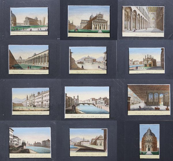 Serie completa di 12 vedute della città, celebre raccolta di Ranieri Grassi intitolata Rappresentazione degli edifizi più cospicui di Pisa in XII tavole […], edita da R. Prosperi nel 1834 e nel 1839. ' Incisioni in rame, magnifica coloritura coeva, in perfette condizioni. Complete series of 12 views of the cities, the famous collection of Ranieri Grassi Rappresentazione degli edifizi più cospicui di Pisa in XII tavole […], published by R. Prosperi in 1834 and 1839. ' Copperplate, beautiful coeval colouring, in perfect condition. Cfr. Tosi L. (a cura di) "Pisa e il suo territorio: tra cartografia e vedutismo dal XV al XIX sec.", pag. 163 e ss.