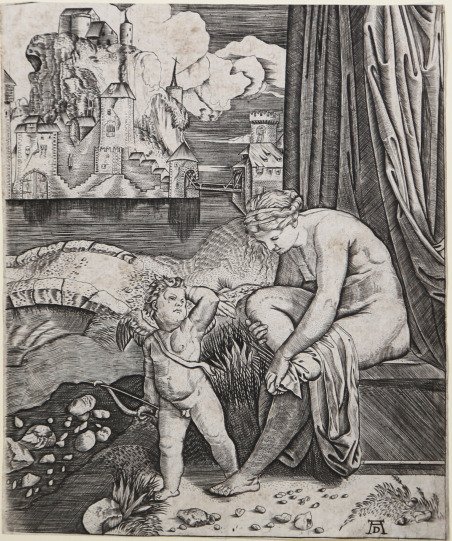 Bulino, 1520-30 circa, monogrammata AD (monogramma di Duerer), in basso a destra. Da un’incisione di Marcantonio Raimondi. Buona prova, impressa su carta vergata coeva, rifilata al rame, assottigliamento della carta in corrispondenza degli angoli, per il resto in ottimo stato di conservazione.Rispetto all’incisione dello stesso soggetto realizzata da Marcantonio Raimondi, che risulta in controparte, questa copia mostra sullo sfondo, attraverso una sorta di finestra, un paesaggio tipicamente nordico. Lo stile incisorio rimanda alla scuola del Raimondi. Si è pensato che il soggetto dell’incisione possa essere la settima scena, perduta, sulla parete nord della stufetta vaticana del cardinal Bibbiena, decorata da Raffaello e dalla sua cerchia con episodi della vita di Venere. Circa l’identificazione con la perduta scenetta del Bibbiena, cfr. Oberhuber, p. 335 e Mason, n. 69.Dell’incisione del Raimondi esistono varie repliche che ne attestano il vasto successo, tra cui quella di Altdorfer.La scena è di una raffinatezza delicata: Venere seduta, nuda, con un’espressione dolce e assorta, è chinata in avanti nell’atto di asciugarsi un piede con una veste. Accanto a lei, in piedi è Cupido alato, con il suo arco nella sinistra, e la mano destra tra i riccioli. Dalla finestra alle loro spalle, si scorge un paesaggio collinare. Il drappeggio sulla sinistra, con le sue pieghe, conferisce profondità spaziale alla scena. Bibliografia Barstch: XIV, p. 224; Delaborde, p. 161 n. 115; Hind, V, n. 44; Passavant, III, p. 281 n. 43; Raphael Invenit, p. 63 n. VII. 4. Engraving, about 1520-30, unsigned. Single state. A good proof, printed on contemporary laid paper, trimmed to copperplate, restoration at upper right corner perfectly executed, otherwise in excellent condition. Copy in reverse after Marcantonio Raimondi, with a landscape setting in place of the room with a window. The buidings in the background are suggested by those in Dürer’s Hercules of about 1500, the stone bridge and stream with stones on the bank are copied from Dürer’s Virgin and Child with the Monkey of about 1498.It is thought that the subject of the engraving may be the seventh scene, lost, on the north wall of the Stufetta by Cardinal Bibbiena, decorated by Raphael and his circle with episodes from the life of Venus.About identification with the lost scene of Bibbiena, see. Oberhuber, p. 335 And Mason 335, n. 69. Raimondi’s engraving is available in several replicas that attest to the vast success, including that of Altdorfer. The scene is of a delicate refinement: Venus sitting, naked, with a sweet and thoughtful, is leaning forward in the act of wiping foot with a robe. Beside her, standing is winged Cupid with his bow in his left hand and the right hand between the curls. From the window behind them, you can see a hilly landscape. The draping on the left, with its folds, gives spatial depth to the scene. Bibliografia Barstch: XIV, p. 224; Delaborde, p. 161 n. 115; Hind, V, n. 44; Passavant, III, p. 281 n. 43; Raphael Invenit, p. 63 n. VII. 4. Cfr.