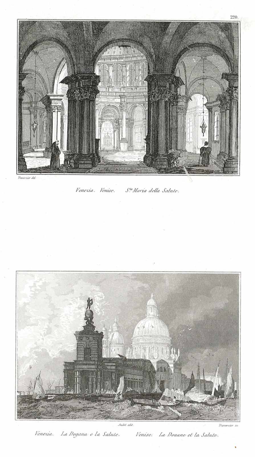 Stampa antica ed originale con due piccole vedute in unico foglio dell' interno della chiesa e dei due monumenti visti dalla Laguna.