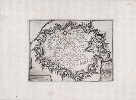 Pianta della città fortificata tratta dal Les forces de l’Europe ou description des principals villes…Paris: Chez l'Auteur, 1693-1696. ' Noto atlante militare francese, anche se, prevalentemente, si tratta di mappe, piani e vedute di fortificazioni di città europee in Francia, Germania e Paesi Bassi, l'atlante include anche una serie di altre regioni, tra cui Malta, Costantinopoli, Tripoli e altrove. ' Nicholas de Fer (1646-1720) era figlio di un venditore di mappe, Antoine de Fer, e divenne uno dei cartografi più noti della Francia del XVII secolo. A dodici anni fu apprendista presso l'incisore Louis Spirinx. Quando il padre morì nel 1673, Nicholas aiutò la madre a gestire l'attività fino al 1687, quando divenne l'unico proprietario. Nel 1697 pubblicò il suo primo atlante mondiale. Dopo la sua morte, avvenuta nel 1720, l'attività passò ai suoi generi, Guillaume Danet e Jacques-Francois Benard. Incisione in rame, in buono stato di conservazione. Pianta della città fortificata tratta dal Les forces de l’Europe ou description des principals villes…Paris: Chez l'Auteur, 1693-1696. ' Noto atlante militare francese, anche se, prevalentemente, si tratta di mappe, piani e vedute di fortificazioni di città europee in Francia, Germania e Paesi Bassi, l'atlante include anche una serie di altre regioni, tra cui Malta, Costantinopoli, Tripoli e altrove. ' Nicholas de Fer (1646-1720) era figlio di un venditore di mappe, Antoine de Fer, e divenne uno dei cartografi più noti della Francia del XVII secolo. A dodici anni fu apprendista presso l'incisore Louis Spirinx. Quando il padre morì nel 1673, Nicholas aiutò la madre a gestire l'attività fino al 1687, quando divenne l'unico proprietario. Nel 1697 pubblicò il suo primo atlante mondiale. Dopo la sua morte, avvenuta nel 1720, l'attività passò ai suoi generi, Guillaume Danet e Jacques-Francois Benard. Incisione in rame, in buono stato di conservazione. Cfr.