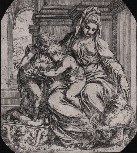 Acquaforte e bulino, privo di data, siglato in lastra in basso a destra “P Fari I”; al centro, in basso, l’excudit di Gaspare dall’Oglio “Gasparo daholio exc”. Esemplare nello stato finale con gli angoli smussati e parziale perdita dell’inciso. Bella prova, impressa su carta vergata coeva, rifilata alla linea marginale, in ottimo stato di conservazione.L’incisione di Orazio Farinati riproduce un disegno non noto di Paolo Farinati. Gioconda Albricci descrive quattro stati della lastra: I) firmata in basso a destra: "P.F.I."; nel margine inferiore, al centro: ".HO.F.F."; nell'inciso, in basso al centro: "Gasparo dalolio exc"; nell'angolo inferiore destro si vede una conchiglia, in basso a sinistra vi è una scritta;II) l'angolo inferiore sinistro è rotto e della scritta rimane solo la lettera finale "S";III) la lastra è stata rifilata immediatamente sotto la linea inferiore dell'inciso e della scritta ".HO.F.F." non rimangono che i tratti superiori delle "F";IV) a seguito alla rottura dell'angolo inferiore sinistro della lastra, anche i rimanenti angoli sono stati smussati; in basso a destra si legge: "P Fari I".Circa la datazione, abbiamo un sicuro terminus post, il 1583, che costituisce l’anno di inizio dell’attività editoriale di Gaspare dall’Oglio. La data appare proprio su un’opera incisa da Orazio “Il passaggio del Mar Rosso”. La sua attività editoriale è documentata fino al 1599. Propendiamo per una datazione intorno al 1590, poiché altre incisioni di Orazio da modelli di Paolo recano date comprese tra il 1589 e il 1593. Etching, not dated, lettered at bottom 'Gasparo dalolio exc P Fari I'. Example in its final state, in which the corners have been rounded losing lettering.A good example, printed on contemporary laid paper, trimmed to platemark, in good condition.The scene, after a lost drawing by Paolo Farinati, shows the Virgin and Christ Child who sits on her knee taking fruit held in a cloth by the young John the Baptist, at bottom right is a lamb.Albricci supposed that the plate had four states, and this is the fourth state (second of two according Bartsch) impression printed from the octogonal plate. Albricci supposed that Paolo Farinati may have seen Giulio Romano's paintings representing the Virgin (Holy Family in Madrid, Prado, and Madonna della Gatta, Museo di Capodimonte, Naples), because of the Roman influences in this print. Cfr. Bartsch XVI.169.3.II; G. Albricci Le incisioni di Paolo e Orazio Farinati, Saggi e Memorie di Storia dell'Arte. 12, 1980, pp. 25-26, n. 3; G. Marini, Paolo Farinati 1524 – 1606, pp. 207-219