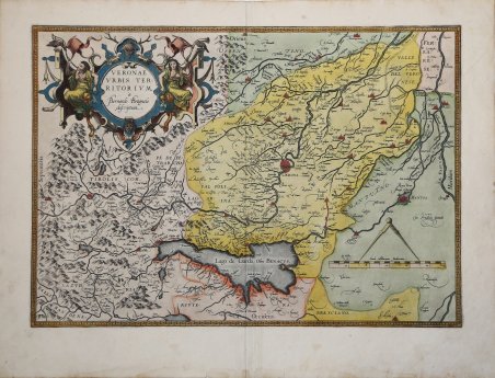 Carta geografica del territorio veronese, che comprende Mantova, Vicenza e il lago di Garda, per la prima volta edita nel Theatrum Orbis Terrarum di Ortelius del 1579. La carta deriva dalla celebre mappa di Bernardo Brugnolo edita da Paolo Forlani nel 1574. Il ' Theatrum Orbis Terrarum ' è considerato il primo vero “atlante” moderno. L’opera fu pubblicata in 7 lingue e 36 edizioni, per il quale – nel 1570 - Ortelius ottenne il ' privilegio, ovvero una sorta di diritto d'autore che impediva ad altri cartografi di pubblicare i propri lavori. Il ' Theatrum ' rappresentava il lavoro più avanzato del lavoro della descrizione cartografica. L’Ortelius vi raccolse il sapere geografico e cartografico del suo tempo, proponendo in 147 spettacolari tavole incise l’immagine più fedele del mondo allora conosciuto e, in alcune straordinarie “carte storiche”, regioni e itinerari tratti dalla letteratura, dalla mitologia, dalla tradizione. Ortelius fu anche il primo a citare le fonti, menzionando i nomi dei cartografi nel “catalogus auctorum”. Dal 1598 al 1612 le edizioni postume del ' Theatrum ' furono realizzate dal suo collaboratore Johannes Baptiste Vrients. Esemplare in meravigliosa coloritura coeva. Nice old color example of the Ortelius' map of Verona, based upon Brugnoli's map, which was issued by Forlani in Venice in 1574. Centered on Verona, and including Mantua, and Lake of Garda. Map taken from the ' Theatrum Orbis Terrarum, which is considered the first true modern "Atlas". The work was published in 7 languages and 36 editions, for which - in 1570 - Ortelius obtained the privilege, a kind of copyright that prevented other cartographers from publishing his works. The ' Theatrum ' represented the most advanced work of cartographic description. Ortelius collected in it the geographical and cartographic knowledge of his time, proposing in 147 spectacular engraved plates the most faithful image of the world then known and, in some extraordinary "historical maps", regions and routes taken from literature, mythology, tradition. Ortelius was also the first to cite sources, mentioning the names of cartographers in the "catalogus auctorum". From 1598 to 1612 the posthumous editions of the ' Theatrum ' were made by his collaborator Johannes Baptiste Vrients. Copper engraving, contemporary coloring, in good condition. Cfr. M. Van den Broecke "Ortelius Atlas Maps" (2011), n. 120.