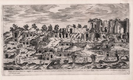 Veduta tratta dall'opera I vestigi dell'antichità di Roma raccolti et ritratti in perspettiva da Stefano Du Perac parisino, pubblicata per la prima volta a Roma nel 1575 da Lorenzo Vaccari. Il volume consta di quaranta fogli tutti di tavole: il primo funge da frontespizio; nel secondo è ospitata la dedica a “Giacomo Buoncompagni governator generale di Santa Chiesa”. Étienne Du Pérac vi palesa le proprie intenzioni e in particolare sottolinea che “sarà dunque utile il libro […] et grato, et accetto agli studiosi dell’antichità per la diligenza che io ho usata in rappresentare fedelmente i residui della Romana grandezza”. Si affida poi all’ “autorità e virtù” del dedicatario perché possa favorire l’opera “bisognosa di molto lume” a causa dell’“oscurità dell’auttore”. In realtà, quando pubblica il libro, Étienne du Pérac è a Roma da oltre quindici anni, ed è noto se non altro per aver fornito la propria opera all’erudito veronese Onofrio Panvinio e aver dato alle stampe nel 1574 la pianta archeologica Urbis Romae Sciographia, ricostruzione topografica della Roma antica, cui sarebbe seguita, nel 1577, la pianta della Roma moderna, la Nova urbis Romae descriptio. Certo il mercato dell’editoria antiquaria era piuttosto affollato: nello stesso 1575 esce ad esempio per iniziativa di un altro francese, lo stampatore Antonio Lafreri (Antoine Lafréry), con il quale peraltro lo stesso Du Perac collabora, la raccolta iconografica Speculum Romanae Magnificentiae, che riunisce, incise da vari artisti, molte più immagini de I vestigi, non seguendo un’impostazione topografica e non, limitandosi agli edifici antichi ma inserendone di moderni nonché un repertorio di statue. Qui Du Pérac, partendo dal Campidoglio, scandisce il suo itinerario in trentanove tappe: in calce a ogni pagina una didascalia di poche righe fornisce le informazioni essenziali sugli edifici e le rovine. Non si tratta però di raffigurazioni di singoli monumenti, né tanto meno di ricostruzioni ideali, ma di vere e proprie vedute: immagini di grande qualità, paragonabili a quelle edite nel 1551 dall’incisore fiammingo Hieronymus Cock. Etienne Du Pérac o Duperac, nativo di Bordeaux o Parigi, si trasferisce presto a Venezia, dove apprende l’arte dell’incisione realizzando vari soggetti da Tiziano, principalmente per l’editore Giovanni Francesco Camocio. Arriva a Roma nel 1559 dove si dedica allo studio dell’architettura e delle antichità, con particolare attenzione alle opere di Michelangelo. A Roma conosce Onofrio Panvinio, archeologo ed antiquario, che lo influenza e lo introduce allo studio delle antichità romane. Come tutti gli artisti provenienti dal Nord Europa, rimane affascinato dalla maestosità delle rovine romane, decidendo di studiarle e raffigurarle. Le precedenti rappresentazioni dei monumenti di Roma, ad esempio quelle eseguite da Hieronimus Cock intorno al 1550, erano pittoriche ed arricchite da elementi di fantasia. La notevole importanza delle vedute di Roma del Duperac sta nel fatto che furono rappresentate con assoluta precisione archeologica e topografica, tanto da essere oggi studiate con grande attenzione dagli studiosi di archeologia, poiché spesso rappresentano monumenti e siti oggi andati perduti. L'opera ebbe ben 8 edizioni successive, alcune a cura della tipografia De Rossi. Incisione in rame, in ottimo stato di conservazione. View taken from the work I vestigi dell'antichità di Roma raccolti et ritratti in perspettiva da Stefano Du Perac parisino, published for the first time in Rome in 1575 by Lorenzo Vaccari. The volume consists of forty plates: the first serves as a frontispiece; the second contains the dedication to "Giacomo Buoncompagni governator generale di Santa Chiesa". Étienne Du Pérac expresses his intentions and in particular emphasizes that "the book [.] will therefore be useful and grateful, and accepted by scholars of antiquity for the diligence I have used in faithfully representing the remains of Roman grandeur". He then relies on the "authority and virtue" of the dedicatee so that he can encourage the work "in need of much light" because of the "obscurity of the author". When he published the book, Étienne du Pérac had been in Rome for more than fifteen years, and was known, if only for having supplied his work to the Veronese scholar Onofrio Panvinio and for having printed in 1574 the archaeological map Urbis Romae Sciographia, a topographical reconstruction of ancient Rome, which would be followed, in 1577, by the map of modern Rome, the Nova urbis Romae descriptio. Certainly the market of antiquarian publishing was quite crowded: in the same year 1575, for example, another Frenchman, the printer Antonio Lafreri (Antoine Lafréry), with whom Du Perac also collaborated, published the iconographic collection Speculum Romanae Magnificentiae, which brought together, engraved by various artists, many more images than I vestigi, not following a topographical approach and not limiting himself to ancient buildings but including modern ones as well as a repertoire of statues. Here Du Pérac, starting from the Capitol, outlines his itinerary in thirty-nine stages: at the bottom of each page a caption of a few lines provides essential information about the buildings and ruins. However, these are not representations of individual monuments, nor ideal reconstructions, but real views: images of great quality, comparable to those published in 1551 by the Flemish engraver Hieronymus Cock. Etienne Du Pérac or Duperac, born in Bordeaux or Paris, soon moved to Venice, where he learned the art of engraving by making various subjects from Titian, mainly for the publisher Giovanni Francesco Camocio. He arrived in Rome in 1559 where he devoted himself to the study of architecture and antiquities, with particular attention to the works of Michelangelo. In Rome he knows Onofrio Panvinio, archaeologist and antiquarian, who influences him 