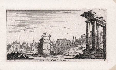 Veduta tratta dalla serie ' Veue de plusieurs édifices tant de Rome que des environs. “Suite de 13 pièces numérotées au bas, à droite, titre compris. On trouve aussi des copies très bien faites de plusieurs de ces pièces; elles sont en sens inverses des originaux. (cfr. Faucheux, Catalogue raisonné de toutes les estampes qui forment l'oeuvre d'Israel Silvestre). Il Silvestre, incisore e disegnatore, nasce a Nancy nel 1621. Come era consuetudine all'epoca, fece diversi viaggi in Italia per copiare i vecchi maestri e per migliorare le sue abilità con i più grandi maestri. Faucheux fissa le date di questi viaggi, il primo prima del 1640 (Israel non aveva ancora 20 anni), il secondo dal 1643 al 1644 e l'ultimo intorno al 1653. Israel portò con sé molte vedute dell'Italia, quasi tutte incise. Fino al 1659, fece altri viaggi in Francia e in Lorena, da cui trasse molti disegni e incisioni. Il suo stile fu, all'inizio, piuttosto sciolto, ma dal 1643 in poi divenne più raffinato e delicato, acquisendo accuratezza e precisione senza essere asciutto, risultando a volte simile a quello di Jacques Callot o di Stefano della Bella, con i quali ebbe rapporti di amicizia attraverso il suo zio materno e mentore, l’editore Israël Henriet. Accanto alle testimonianze per la Roma antica mostrò ben presto un grandissimo interesse per la città "moderna", divenendo uno dei precursori del vedutismo - non solo nel campo incisorio - anticipando artisti come Lievin Cruyl e Gaspar van Wittel. È praticamente impossibile fare un inventario completo delle opere di Israël Silvestre, tanto era prolifico l'artista. Ha lasciato numerosi disegni e più di mille incisioni. Tra le sue opere più belle, possiamo tuttavia menzionare le numerose e complesse “piccole” suite (composte da poche tavole) sulle piazze, le chiese e le antichità di Roma. Acquaforte, in ottimo stato di conservazione. Bibliografia L. E. Faucheux, Catalogue raisonné de toutes les estampes qui forment l'oeuvre d'Israel Silvestre: précédé d'une notice sur sa vie (1857), n. 7.4; F. Baré, Israël Silvestre et sa famille, suivi du catalogue de son oeuvre (1885), n. 859. View taken from the series ' Veue de plusieurs édifices tant de Rome que des environs. “Suite de 13 pièces numérotées au bas, à droite, titre compris. On trouve aussi des copies très bien faites de plusieurs de ces pièces; elles sont en sens inverses des originaux. (cfr. Faucheux, Catalogue raisonné de toutes les estampes qui forment l'oeuvre d'Israel Silvestre). Silvestre, engraver and draftsman, was born in Nancy in 1621. As was customary at the time, he made several trips to Italy to copy the old masters and to improve his skills with the greatest masters. Faucheux fixes the dates of these trips, the first before 1640 (Israel was not yet 20 years old), the second from 1643 to 1644 and the last around 1653. Israel brought with him many views of Italy, almost all of them engraved. Until 1659, he made other trips to France and Lorraine, from which he took many drawings and engravings. His style was, at the beginning, rather loose, but from 1643 onwards became more refined and delicate, acquiring accuracy and precision without being dry, resulting sometimes similar to that of Jacques Callot or Stefano della Bella, with whom he had friendly relations through his maternal uncle and mentor, the publisher Israël Henriet. Alongside the testimonies to ancient Rome, he soon showed great interest in the "modern" city, becoming one of the precursors of vedutism - not only in the field of engraving - anticipating artists such as Lievin Cruyl and Gaspar van Wittel. It is quite impossible here to make a complete inventory of Israël Silvestre's works, so prolific was the artist. He left numerous drawings and more than a thousand engravings. However, among his most beautiful works, we can mention the many complex "small" suites (composed of a few plates) on the squares, churches and antiquities of Rome. Etching, in excellent condition. Bibliografia L. E. Faucheux, Catalogue raisonné de toutes les estampes qui forment l'oeuvre d'Israel Silvestre: précédé d'une notice sur sa vie (1857), n. 7.4; F. Baré, Israël Silvestre et sa famille, suivi du catalogue de son oeuvre (1885), n. 859. Cfr.