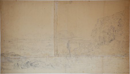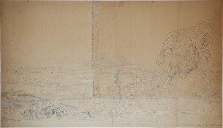 Grande e bellissimo disegno, finemente eseguito a matita. Opera composta da tre fogli di carta di diverse dimensioni, poi uniti. Databile intorno al 1830 ed ascrivibile a mano inglese per il titolo (china nera coeva posto in basso a destra), il disegno rappresenta tutta la valle del sito dove sorge Palermo. Probabilmente bozzetto preparatorio per un dipinto. Large and beautiful drawing, finely executed in pencil. Work composed of three sheets of paper of different sizes, then joined together. Datable around 1830, and ascribable to an English hand for the title (coeval black ink on the lower right), the drawing represents the whole valley of the site where Palermo stands. Probably preparatory sketch for a painting. Cfr.