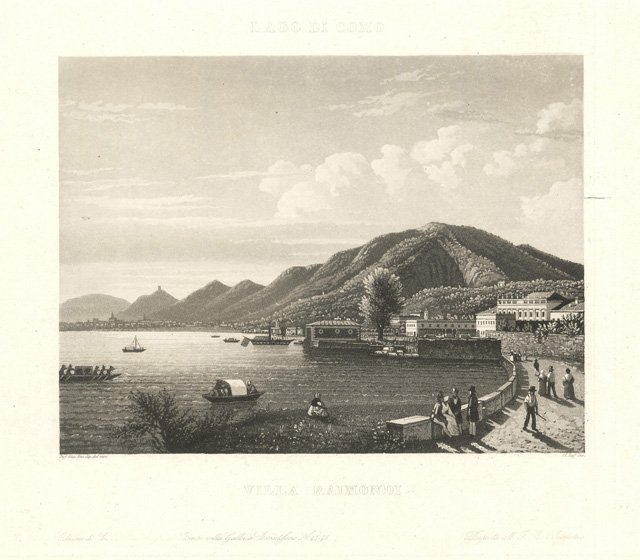 Animata veduta della Villa Raimondi, oggi Villa Olmo, che fissa l'arrivo a Borgo Vico dell'Imperatore Ferdinando I, il giorno 25 agosto del 1838, durante il viaggio che lo porterà a Milano per essere incoronato con la Corona Ferrea. "Le LL. MM. II. RR. vennero accolte, al loro discendere dal battello a vapore, da S. A. il Principe di Metternich e dalle loro Eccellenze il conte di Kolowrat, e il maresciallo conte Radetzki I. R. Comandante in capo del Regno Lombardo-Veneto, non che da tutte le Autorità civili, militari ed ecclesiatiche della provincia" (Gazzetta della Provincia di Como - 1 settembre 1838). L'incisione presenta lievi segni di foxing, che non compromettono il buono stato di conservazione generale.