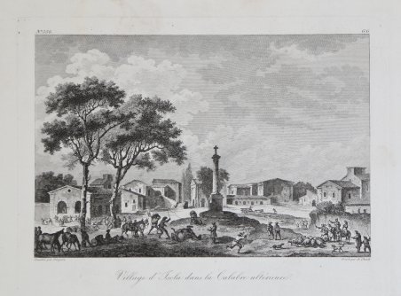 Veduta pubblicata nel ' Voyage Pittoresque ou description des Royaumes de Naples et de Sicile, opera in 5 volumi per la prima volta stampati a Parigi tra 1781 e il 1786. Richard de Saint-Non conobbe, durante il suo viaggio a Roma, i due già celebri pittori francesi Jean Honoré Fragonard e Hubert Robert, con i quali prosegue il suo viaggio per tutto il paese. Da questa grande amicizia nasce l’idea e la collaborazione per l’ambizioso progetto di documentare graficamente tutti i principali monumenti dell’Italia Meridionale e della Sicilia. Da qui, tra il 1781 ed il 1786, con l’aiuto di numerosi ed importanti architetti, pittori ed incisori, venne alla luce il Voyage Pittoresque ou description des Royaume de Naples et de Sicilie, opera composta di cinque volumi che uscirono annualmente. Incredibile sforzo tipografico, l’opera raccoglie quasi per intero gli appunti di viaggio del Saint-Non, adeguatamente assemblati e corretti; il corpus grafico è composto di ben 542 incisioni all’acquaforte e bulino, opera dei principali artisti di riproduzione del periodo. Da un punto di vista editoriale l’iniziativa riscuote immediatamente un grandissimo successo: il libro diviene un vero e proprio modello tipografico, sul quale sono basate diverse pubblicazioni dell’impero napoleonico. Dal punto di vista artistico le vedute, i paesaggi e le rovine conservano, e non può essere altrimenti, lo stile pittorico e romantico del Fragonard, del Robert, del Desprez, e di tutti gli altri artisti che collaborano nella realizzazione di questa monumentale opera. Il notevole successo commerciale della raccolta è testimoniato dalla ristampa, tra il 1795 ed il 1798, delle sole tavole pittoriche. Un’ulteriore edizione è stampata nel 1829 dal Dufour. Esemplare tratto dal ' Voyage Pittoresque, ' seconda edizione del 1795/98, priva dell’indicazione del privilegio reale. ' Acquaforte, stampata su carta vergata coeva, leggere ossidazioni, per il resto in ottimo stato di conservazione. View taken from the Voyage Pittoresque ou description des Royaume de Naples et de Sicilie by Richard de Saint-Non. During his trip to Rome, Richard de Saint-Non met two already famous French painters, Jean Honoré Fragonard and Hubert Robert, with whom he travelled along Italy. Their friendship led to the cooperation for the ambitious project of depicting all the main monuments of Southern Italy and Sicily. Between 1781 and 1786, with the assistance of many contemporary artists, he realized the Voyage Pittoresque ou description des Royaume de Naples et de Sicilie, a five volumes work published annually. As a result of a great typographical effort, the work is a collection of Sain-Non’s travelling notes; the graphic part is made up of 542 engravings and etchings, realized by the most important artists of the period. The work is immediately successful, for the book became a new typographical model for the following publications. From an artistic point of view, the views, landscapes and antiquity keep the Romantic pictorial style of Fragonard, Robert, Desprez and all the other artists that took part in this monumental project. The re-issue, between 1795 and 1798, of the pictorial plates, witnesses the great success of this project. A re-issue of the whole work was edited in 1829 by Dufour. Example taken from the second edition of the work, printed in Paris 1795/98; the plates are without the Royal priviledge. ' Etching, printed on contemporary laid paper, light foxing, otherwise good condition. Cfr. Cremonini pp. 119/129, 73.