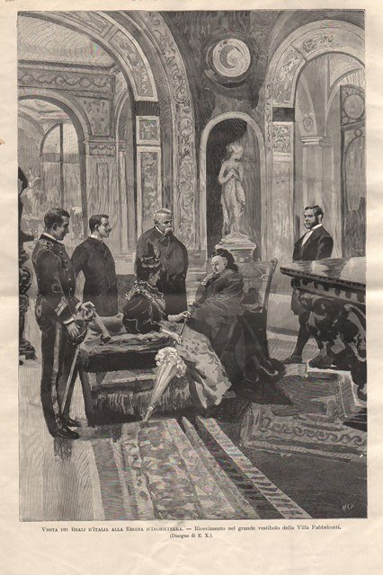Veduta interna di Villa Fabbricotti: il re Umberto I (Torino 1844 - Monza 1900) e la regina Margherita di Savoia (Torino 1851 - Bordighera 1926) incontrano la regina Vittoria (Londra 1819 - Isola di Wight 1901). Testo al retro