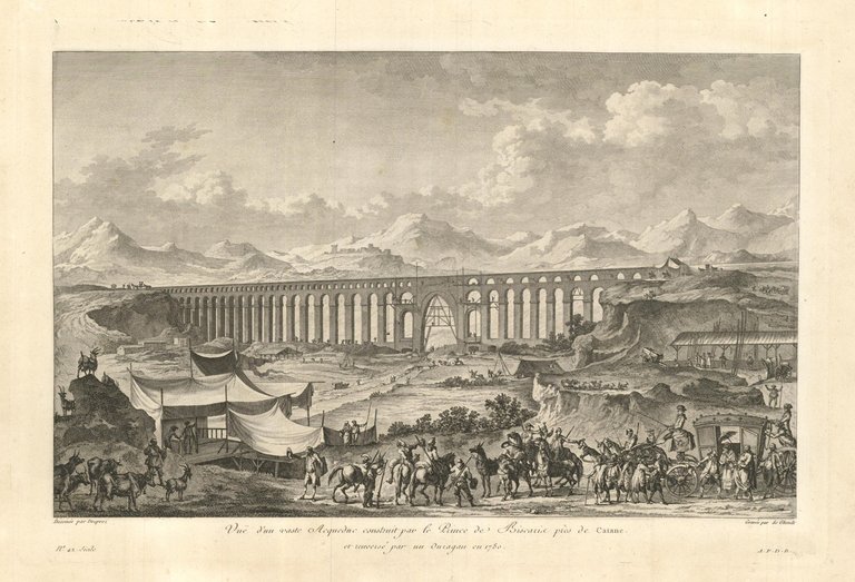 Veduta dell'imponente acquedotto, molto animata in primo piano, da personaggi, cavalli e carrozza. Tratta dalla prima edizione della monumentale opera edita da Jean-Claude Richard de Saint-Non, meglio noto come Abate di Saint-Non " Voyage ou Description des Royaumes de Naples et de Sicilie ". Pubblicata a Parigi dal 1781 al 1786.