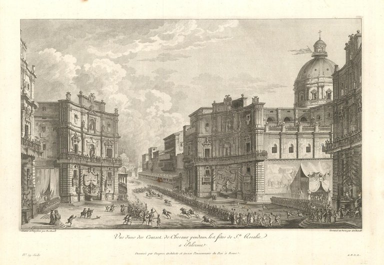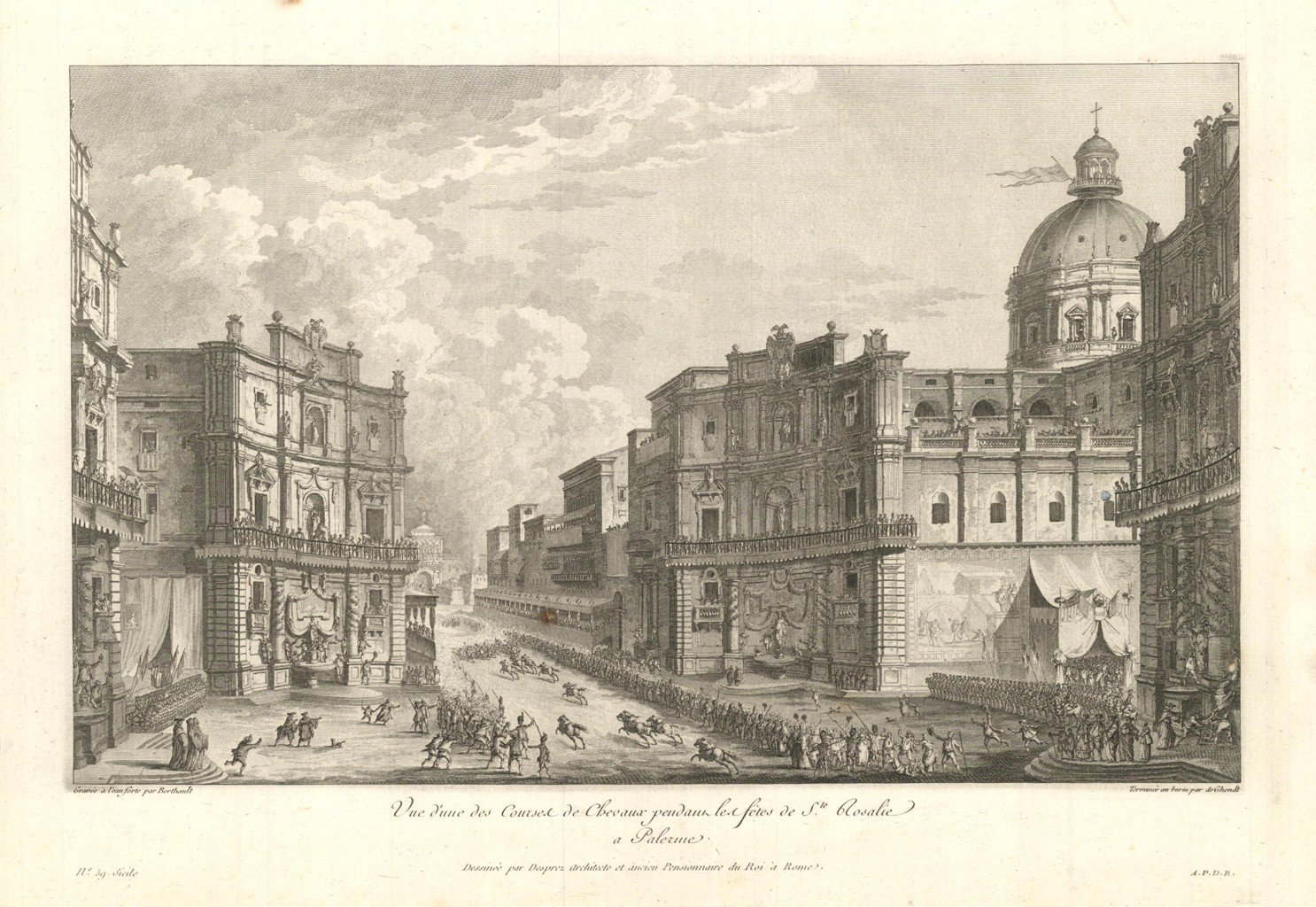 Animata veduta della città di Palermo ritratta durante lo svolgimento di una corsa di cavalli. Tratta dalla prima edizione della monumentale opera edita da Jean-Claude Richard de Saint-Non, meglio noto come Abate di Saint-Non " Voyage ou Description des Royaumes de Naples et de Sicilie ". Pubblicata a Parigi dal 1781 al 1786.