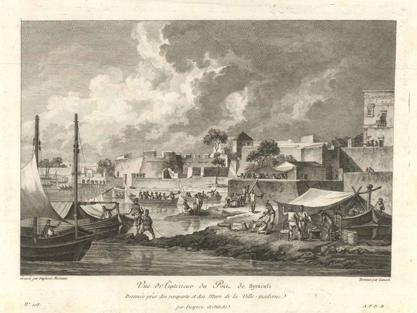 Parziale veduta dell'interno del porto, molto animata, Tratta dalla prima edizione della monumentale opera edita da Jean-Claude Richard de Saint-Non, meglio noto come Abate di Saint-Non " Voyage ou Description des Royaumes de Naples et de Sicilie ". Pubblicata a Parigi dal 1781 al 1786.